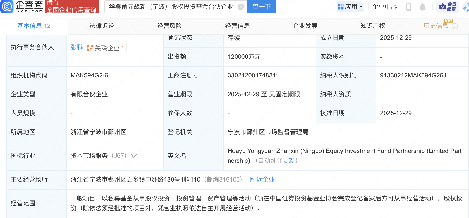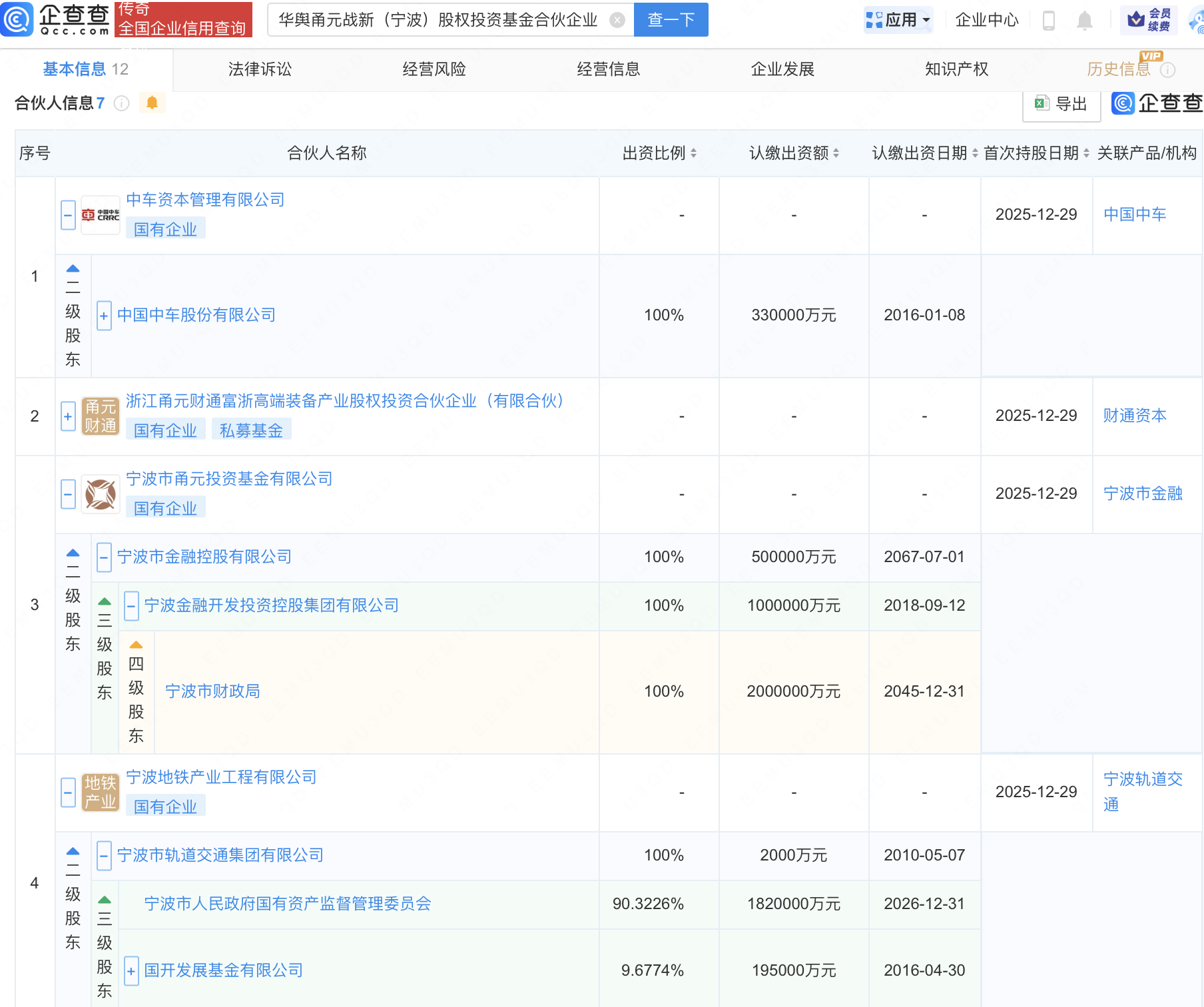 企查查APP显示,近日,华舆甬元战新(宁波)股权投资基金合伙企业(有限合伙)成立,出资额12亿元,经营范围包含:以私募基金从事股权投资、投资管理、资产管理等活动。企查查股权穿透显示,该企业由中国中车(601766)全资子公司中车资本管理有限公司、宁波市甬元投资基金有限公司、宁波地铁产业工程有限公司等共同出资。