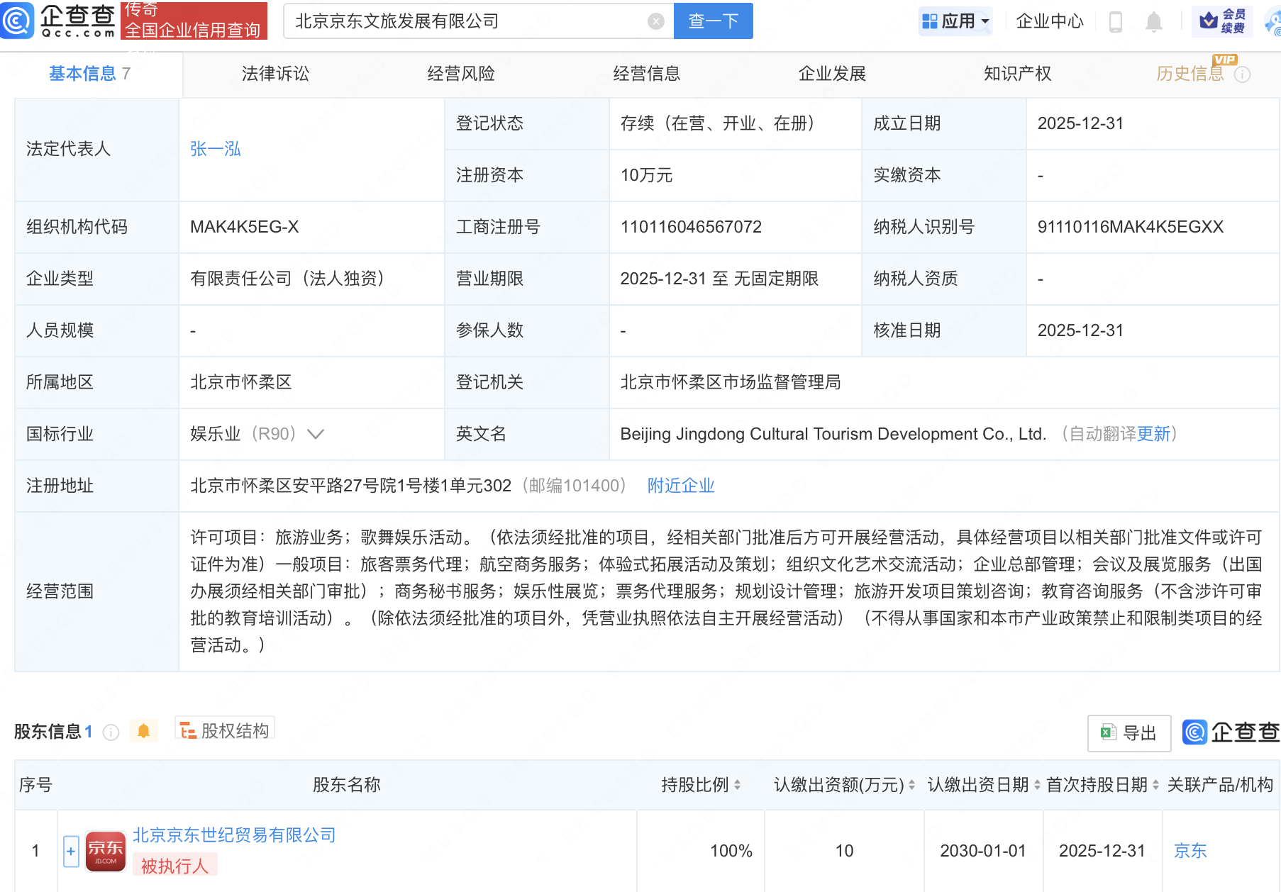 企查查APP显示,近日,北京京东文旅发展有限公司成立,经营范围包含:旅游业务;歌舞娱乐活动;航空商务服务;体验式拓展活动及策划;组织文化艺术交流活动等。企查查股权穿透显示,该公司由北京京东世纪贸易有限公司全资持股。