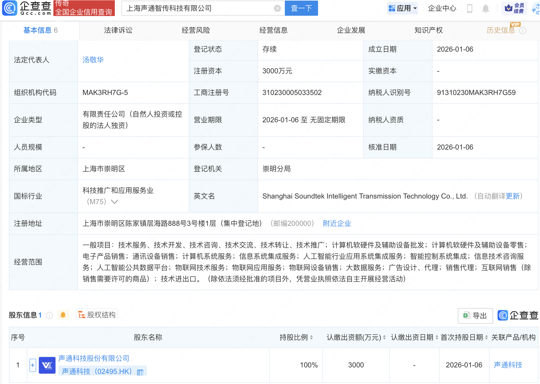 企查查APP显示,近日,上海声通智传科技有限公司成立,注册资本3000万元,经营范围包含:人工智能行业应用系统集成服务;人工智能公共数据平台;物联网技术服务;物联网应用服务;物联网设备销售等。企查查股权穿透显示,该公司由声通科技(02495.HK)全资持股。