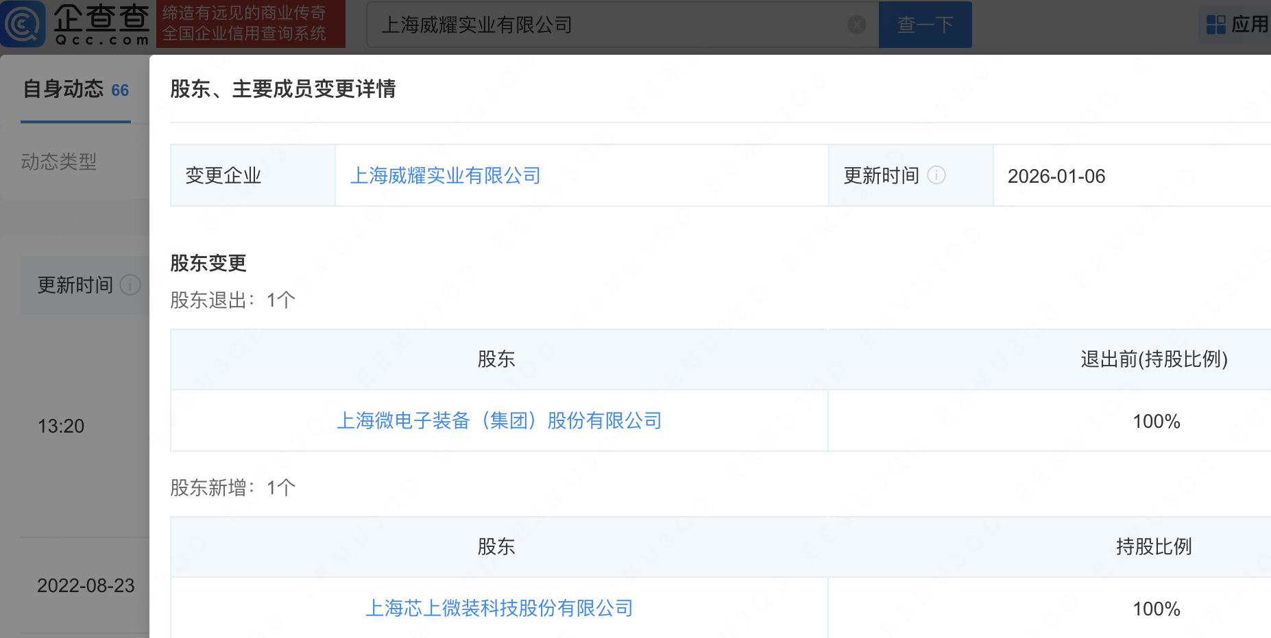 企查查APP显示,近日,上海威耀实业有限公司发生工商变更,上海微电子装备(集团)股份有限公司退出股东,新增上海芯上微装科技股份有限公司为全资股东,认缴出资额2.285亿。企查查信息显示,该公司成立于2003年,经营范围包含:电脑图文设计、制作,园林绿化,机械设备的安装、维修、保养等。