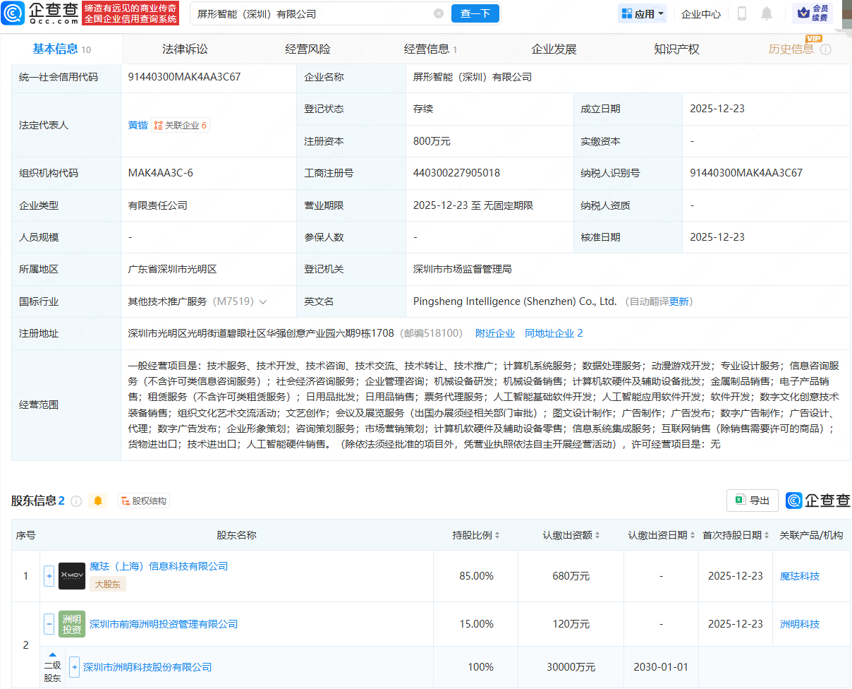企查查APP显示,近日,屏形智能(深圳)有限公司成立,法定代表人为黄锴,经营范围包含:动漫游戏开发;人工智能基础软件开发;人工智能应用软件开发;企业形象策划;咨询策划服务等。企查查股权穿透显示,该公司由魔珐(上海)信息科技有限公司、洲明科技(300232)全资子公司深圳市前海洲明投资管理有限公司共同持股。