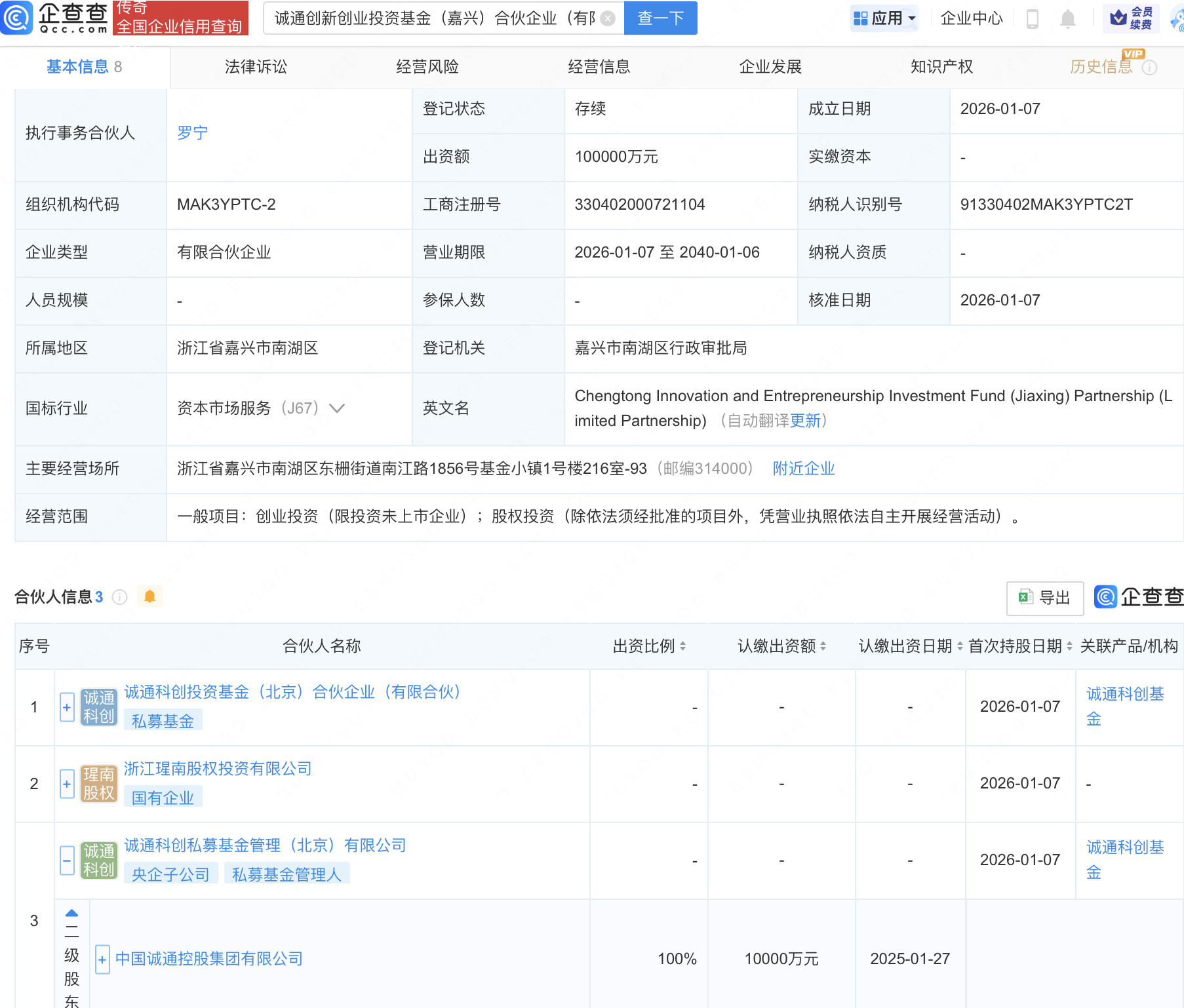 企查查APP显示,近日,诚通创新创业投资基金(嘉兴)合伙企业(有限合伙)成立,出资额10亿元,经营范围包含:创业投资(限投资未上市企业);股权投资。企查查股权穿透显示,该企业由中国诚通控股集团有限公司全资子公司诚通科创私募基金管理(北京)有限公司等共同出资。