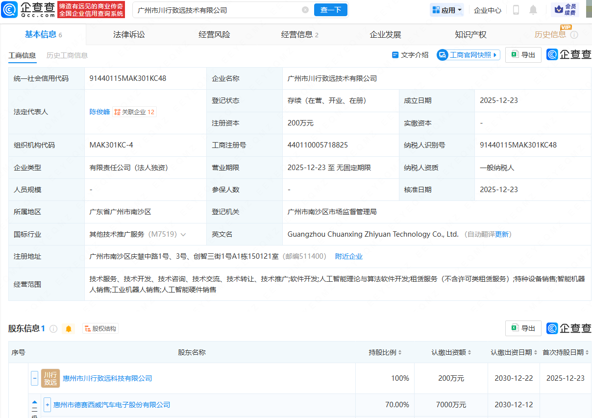 企查查APP显示,近日,广州市川行致远技术有限公司成立,法定代表人为陈俊峰,经营范围包含:人工智能理论与算法软件开发;特种设备销售;智能机器人销售;工业机器人销售;人工智能硬件销售等。企查查股权穿透显示,该公司由德赛西威(002920)旗下惠州市川行致远科技有限公司全资持股。