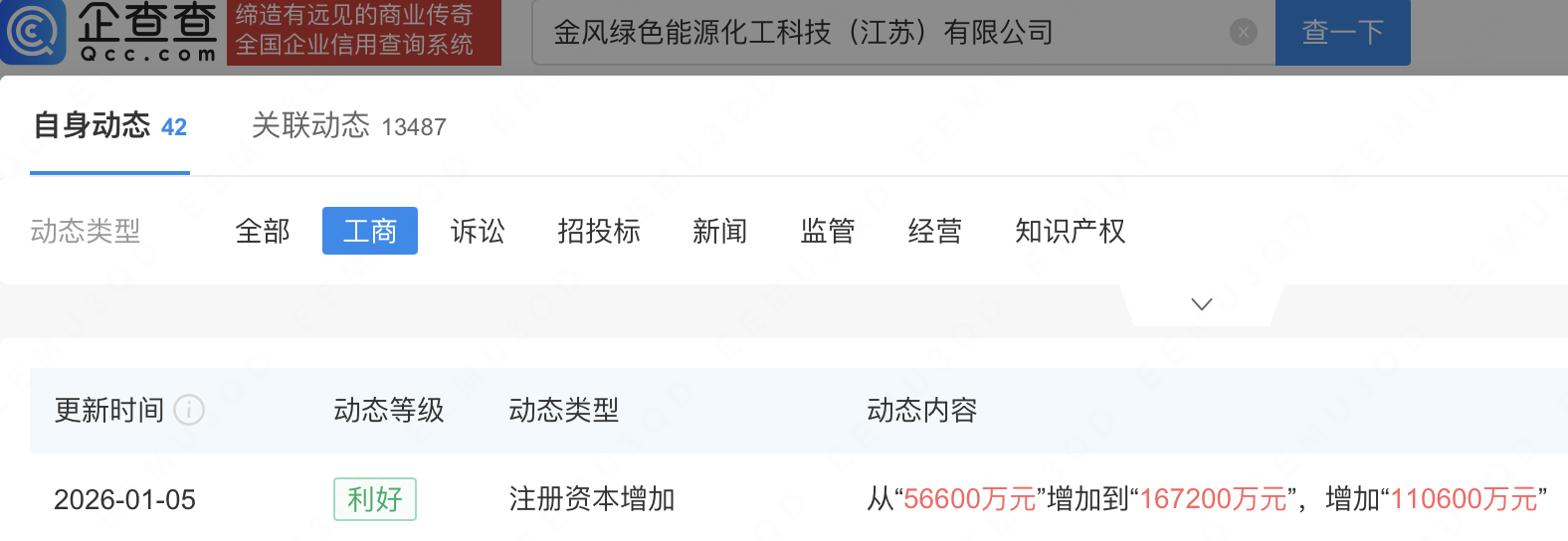 企查查APP显示,近日,金风绿色能源化工科技(江苏)有限公司发生工商变更,注册资本由5.66亿元增至16.72亿元,增幅195%。企查查信息显示,该公司成立于2022年,经营范围包含:货物进出口;技术进出口;工程管理服务等,由金风科技(002202)全资持股。