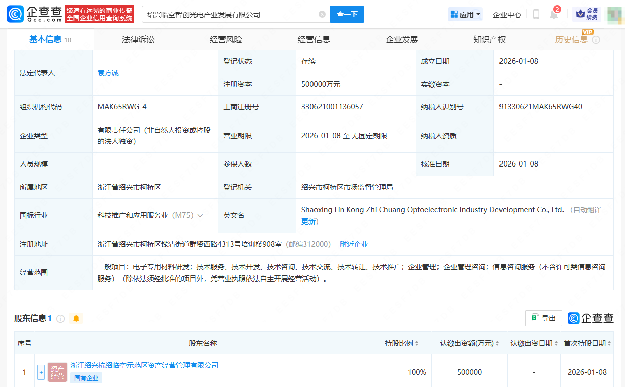 企查查APP显示,1月8日,绍兴临空智创光电产业发展有限公司成立,法定代表人为袁方诚,注册资本50亿人民币,经营范围涉及电子专用材料研发、技术服务、技术开发、技术咨询、技术交流、技术转让、技术推广、企业管理等。企查查股权穿透显示,该公司由浙江绍兴杭绍临空示范区资产经营管理有限公司全资持股。