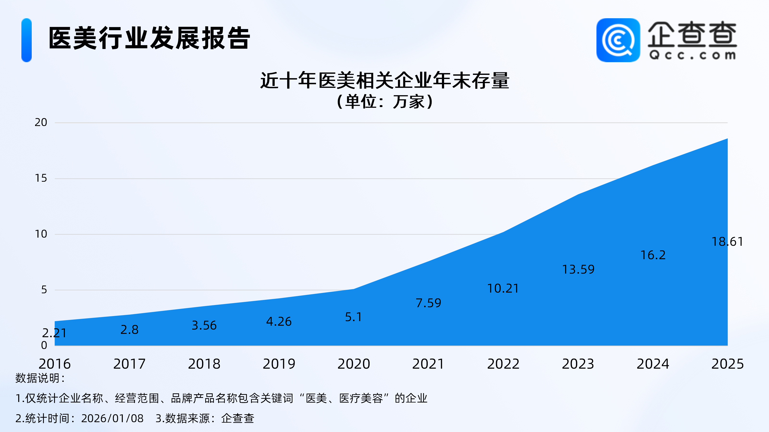 企查查数据显示,截至1月8日,国内现存医美相关企业18.69万家。随着颜值主义的盛行及“悦己消费”的风靡,近十年医美迎来快速发展时期,行业规模不断扩大,从相关企业年末存量分布来看,2022年末医美相关企业存量首次突破十万家,达10.21万家。2025年末全国医美相关企业存量达18.61万家。
