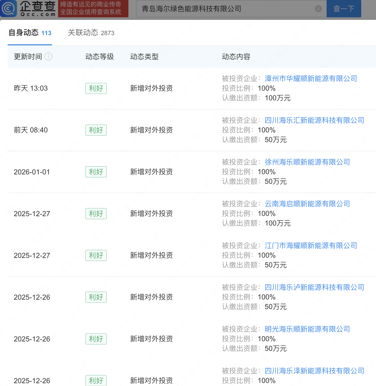 企查查APP显示,近日,漳州市华耀顺新能源有限公司发生工商变更,原股东青岛海乐泽新能源有限公司退出,新增海尔新能源科技股份有限公司全资子公司青岛海尔绿色能源科技有限公司为全资股东。企查查信息显示,近期,四川海乐汇新能源科技有限公司、徐州海乐顺新能源有限公司、云南海启顺新能源有限公司等多家公司陆续发生工商变更,均由青岛海尔绿色能源科技有限公司接盘100%股权。