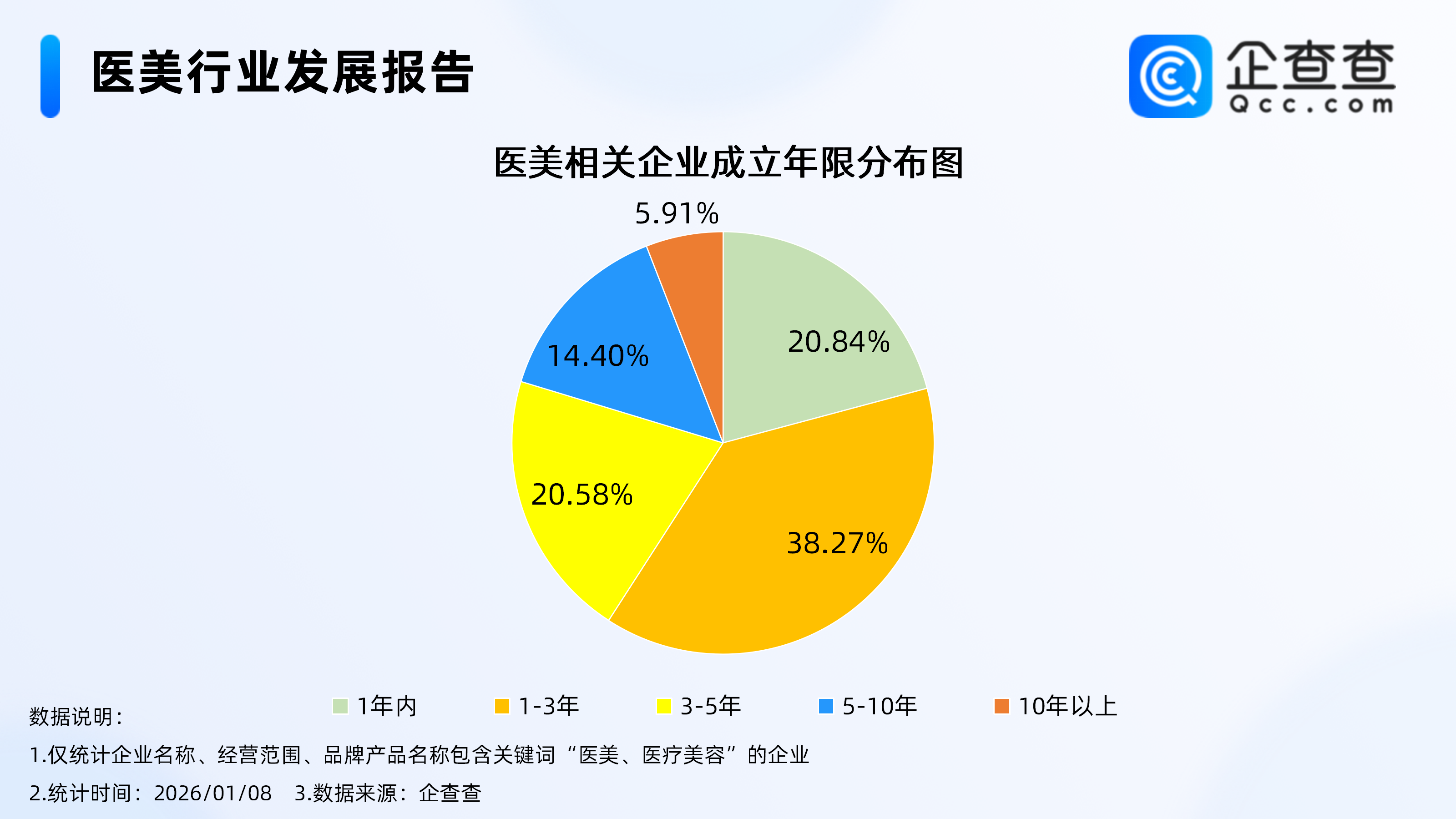 企查查数据显示,从经营时间来看,超五成医美相关企业在近三年成立,其中,成立年限在1-3年的相关企业最多,占比38.27%。其次,成立年限在1年内的相关企业占比20.84%。