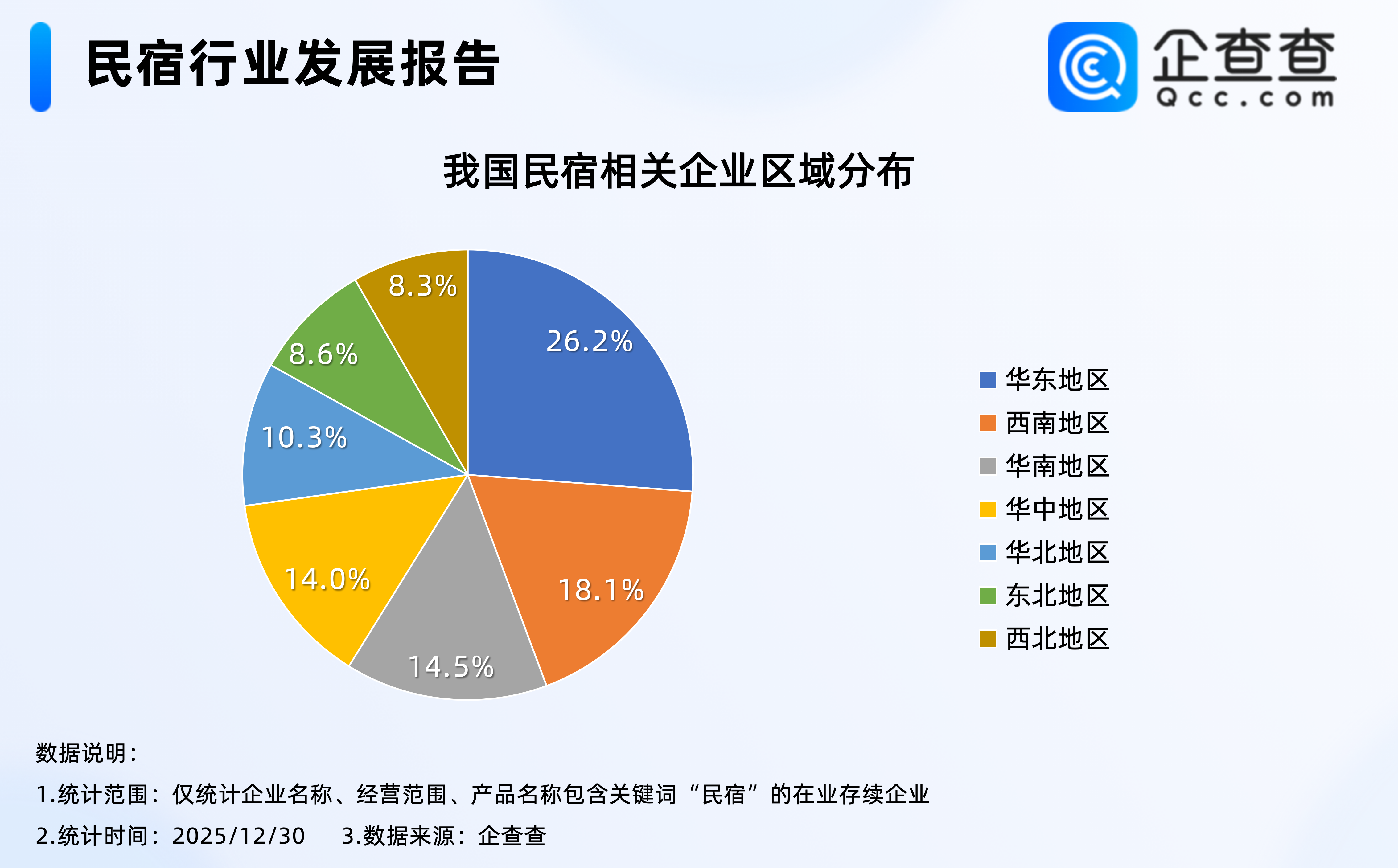 企查查数据显示,截至12月30日,我国现存38.3万家民宿相关企业,区域分布上,我国华东地区民宿相关企业存量最多,占全国总存量的26.2%,其次是西南地区,占比18.1%;注册量方面,截至12月30日,2025年以来我国已注册8.6万家民宿相关企业,与存量区域分布不同的是,新注册企业中,西南地区占比21.5%,超过华东地区,成为2025年以来,全国新注册民宿相关企业最多的区域。