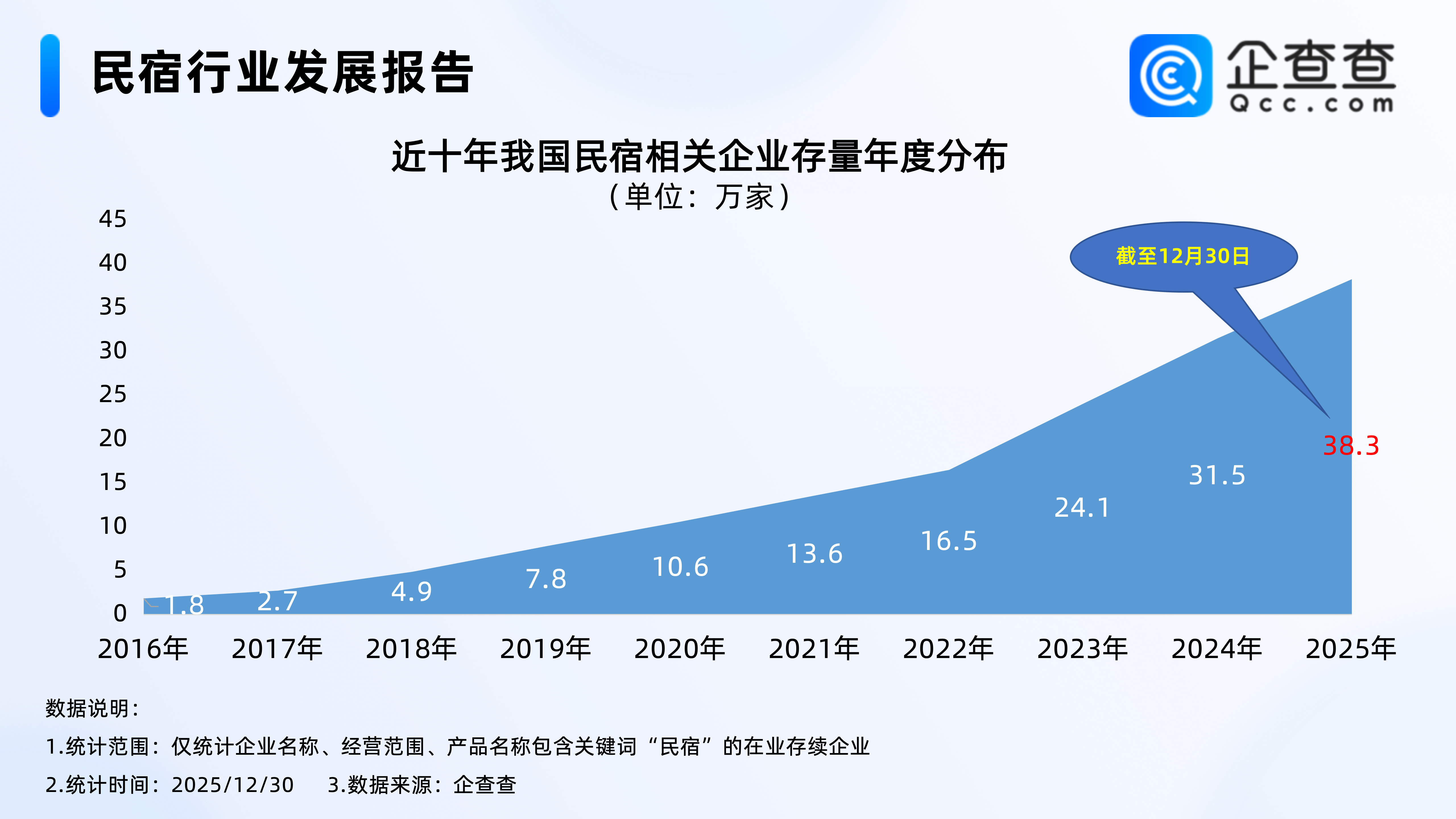 企查查数据显示,2016年以来,我国民宿相关企业存量逐年增加,2022年民宿相关企业存量增速加快,于2024年首次突破30万家,截至12月30日,我国现存38.3万家民宿相关企业。