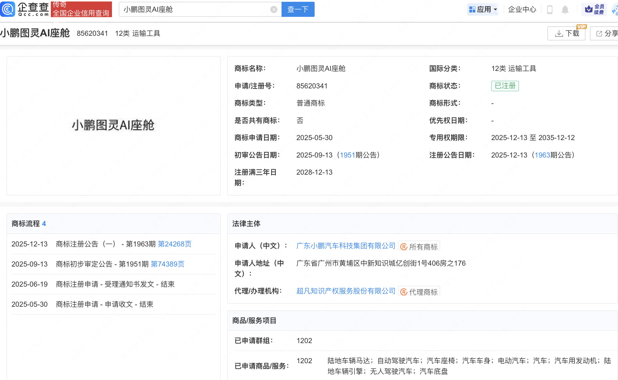 企查查APP显示,近日,广东小鹏汽车科技集团有限公司成功注册1枚“小鹏图灵AI座舱”商标,国际分类为运输工具,已申请商品/服务包括:陆地车辆马达、自动驾驶汽车、无人驾驶汽车等。