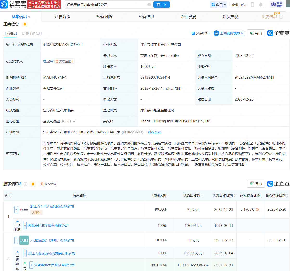 企查查APP显示,近日,江苏天能工业电池有限公司成立,法定代表人为程卫兵,注册资本为1000万元,经营范围包含:电池制造;电池销售;电池零配件生产;电池零配件销售;汽车零部件研发;汽车零部件再制造等。企查查股权穿透显示,该公司由天能股份(688819)旗下浙江省长兴天能电源有限公司、天能新能源(湖州)有限公司共同持股。