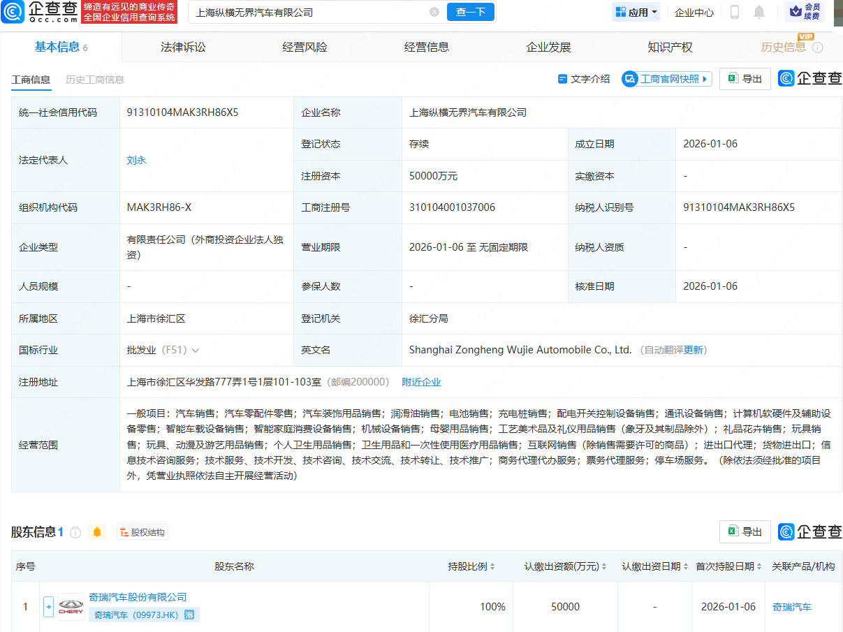 企查查APP显示,近日,上海纵横无界汽车有限公司成立,法定代表人为刘永,注册资本为5亿元,经营范围包含:汽车销售;汽车零配件零售;汽车装饰用品销售;润滑油销售;电池销售;充电桩销售等。企查查股权穿透显示,该公司由奇瑞汽车(09973.HK)全资持股。
