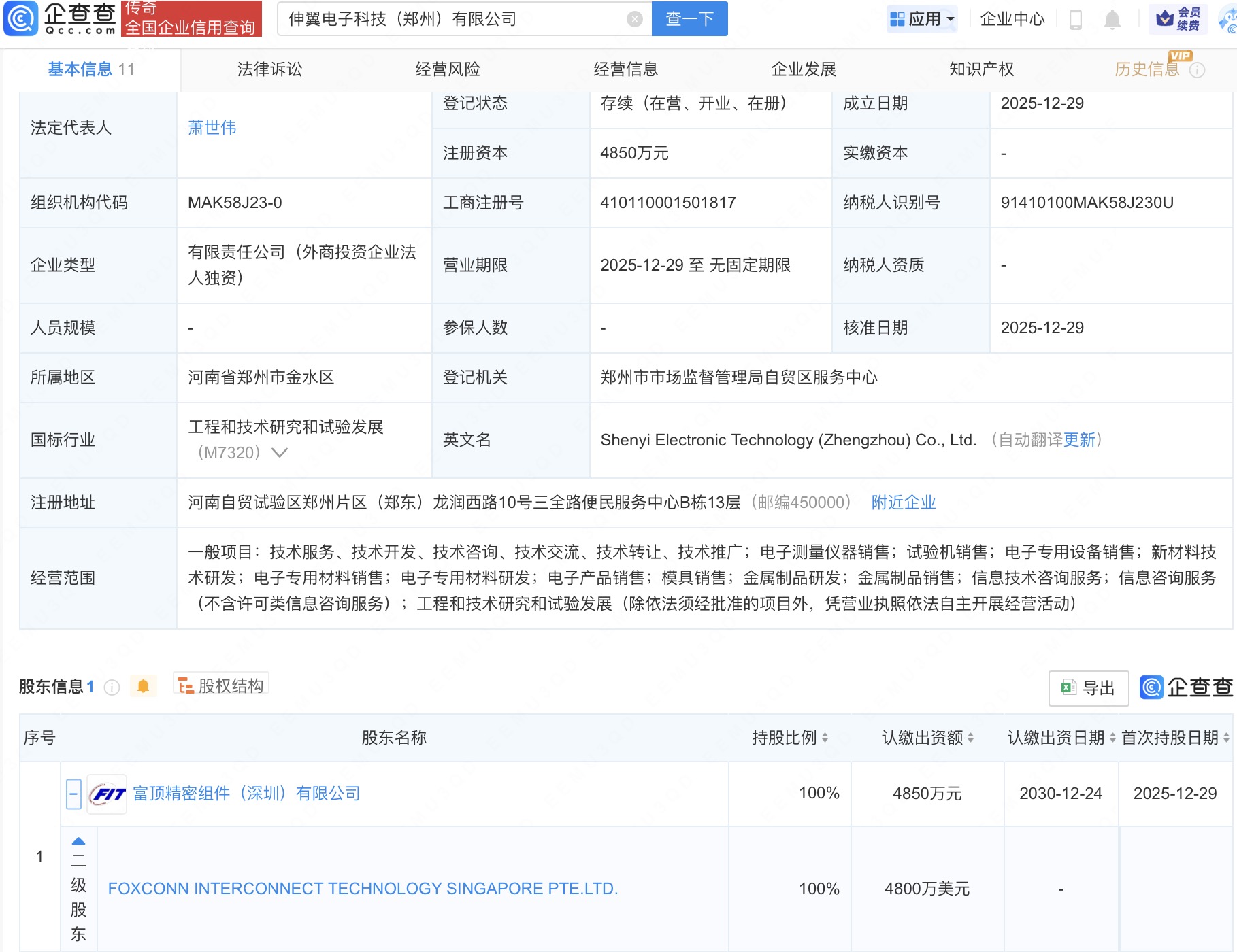 企查查APP显示,近日,伸翼电子科技(郑州)有限公司成立,法定代表人为萧世伟,注册资本4850万人民币,经营范围含电子测量仪器销售、电子专用设备销售、新材料技术研发、电子专用材料销售等。企查查股权穿透显示,该公司由富士康旗下富顶精密组件(深圳)有限公司全资持股。