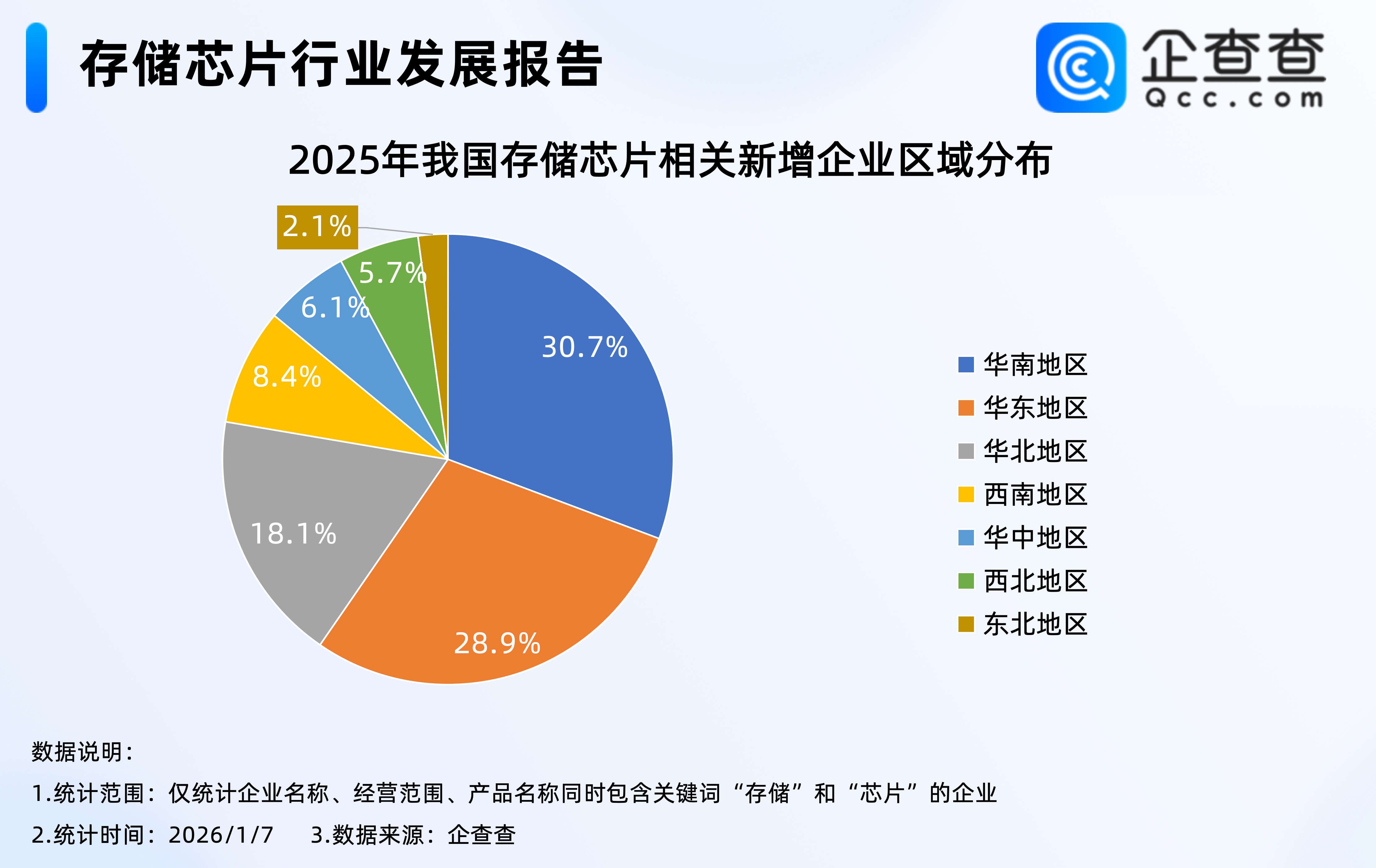 企查查数据显示,2025年以来新注册的1.22万家存储芯片企业中,近六成企业位于华南、华东地区,其中华南地区占比30.7%、华东地区占比28.9%,东北地区相对最少,占比2.1%。