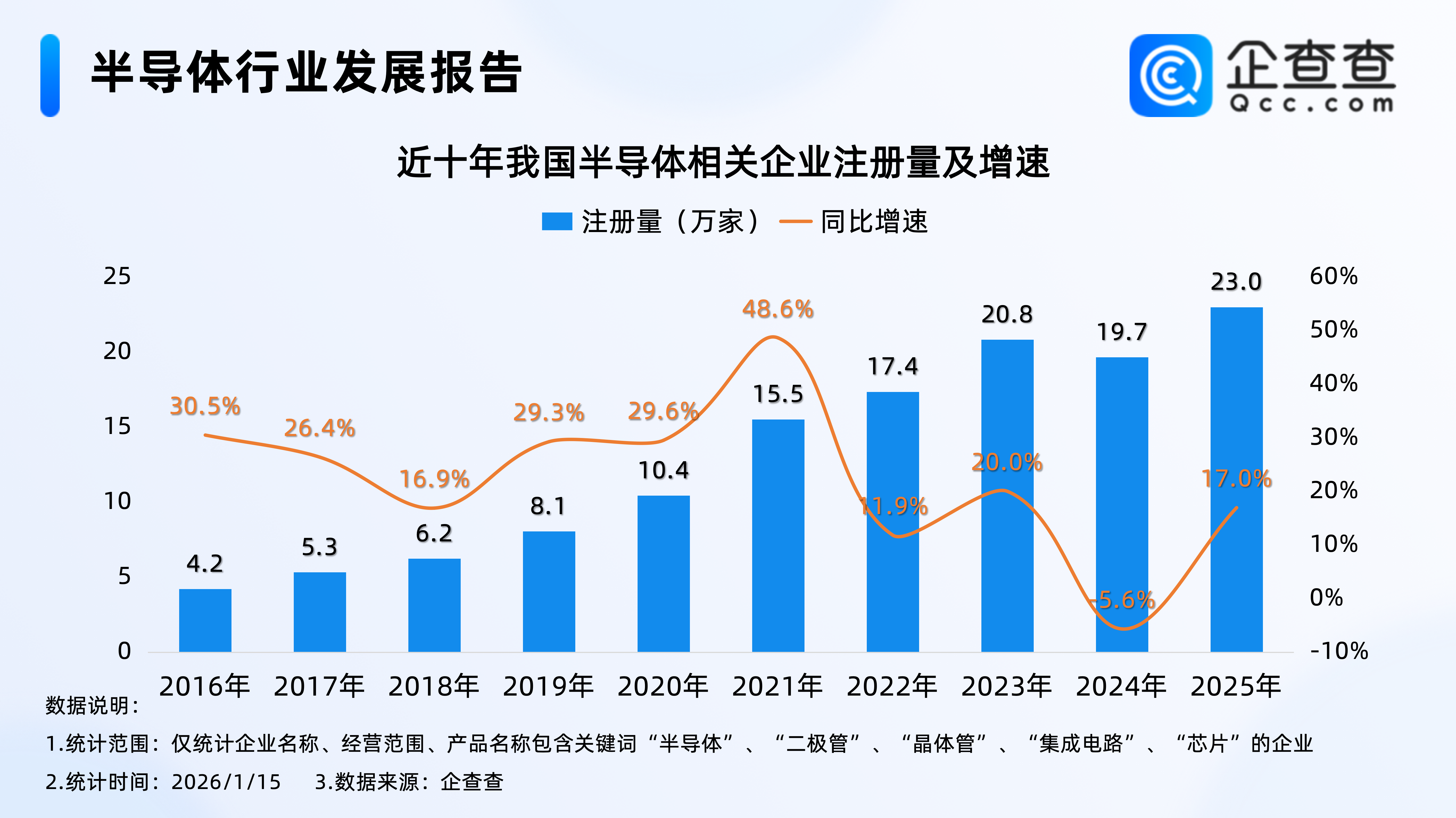 企查查数据显示,近十年,我国半导体相关企业每年注册量基本逐年增加,2023年相关企业注册量首次突破20万家,全年注册量同比增加20.0%至20.8万家;2025年全年,我国累计注册23.0万家半导体相关企业,同比增加17.0%,创近十年相关企业年度注册量新高。