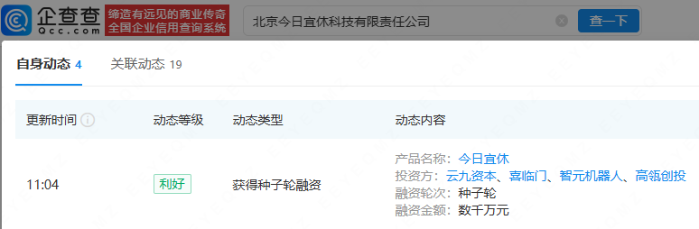 1月20日,“今日宜休”宣布完成总规模为数千万元的种子轮融资,投资方包括高瓴创投(GL Ventures)、智元机器人、喜临门、云九资本等。据悉,公司将在今年下半年陆续发布系列软硬件产品,并计划出海。据悉,“今日宜休”为原小米中国区市场部总经理王腾新创业项目。
