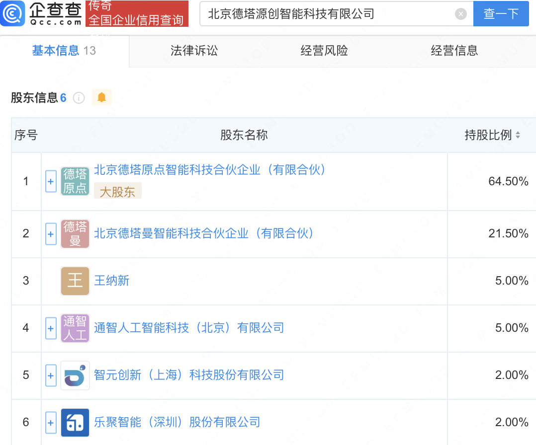 企查查APP显示,近日,北京德塔源创智能科技有限公司成立,经营范围包含:人工智能应用软件开发;计算机系统服务;市场调查(不含涉外调查);智能机器人的研发;智能机器人销售等。企查查股权穿透显示,该公司由智元机器人关联公司智元创新(上海)科技股份有限公司、乐聚机器人关联公司乐聚智能(深圳)股份有限公司等共同持股。