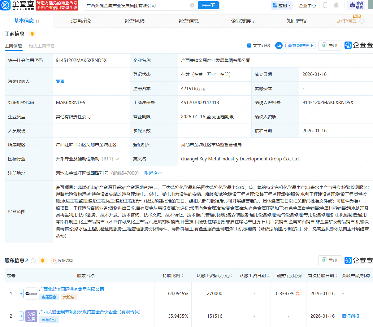 企查查APP显示,近日,广西关键金属产业发展集团有限公司成立,法定代表人为罗勇,注册资本约为42亿元,经营范围包含:非煤矿山矿产资源开采;矿产资源勘查;选矿;常用有色金属冶炼;贵金属冶炼等。企查查股权穿透显示,该公司由广西北部湾国际港务集团有限公司、广西关键金属专项股权投资基金合伙企业(有限合伙)共同持股。