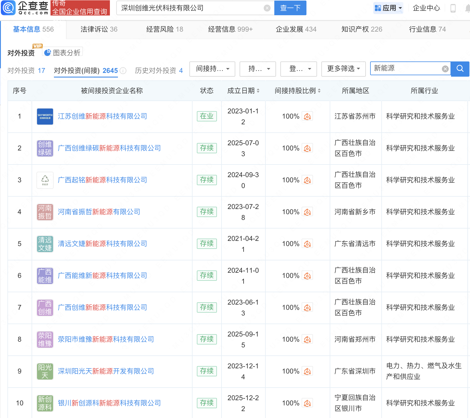 企查查APP显示,近日,深圳创维光伏科技有限公司间接投资多家新能源公司,包括百色启源科技有限公司、河北维储新能源科技有限公司、银川新创源科新能源科技有限公司等。