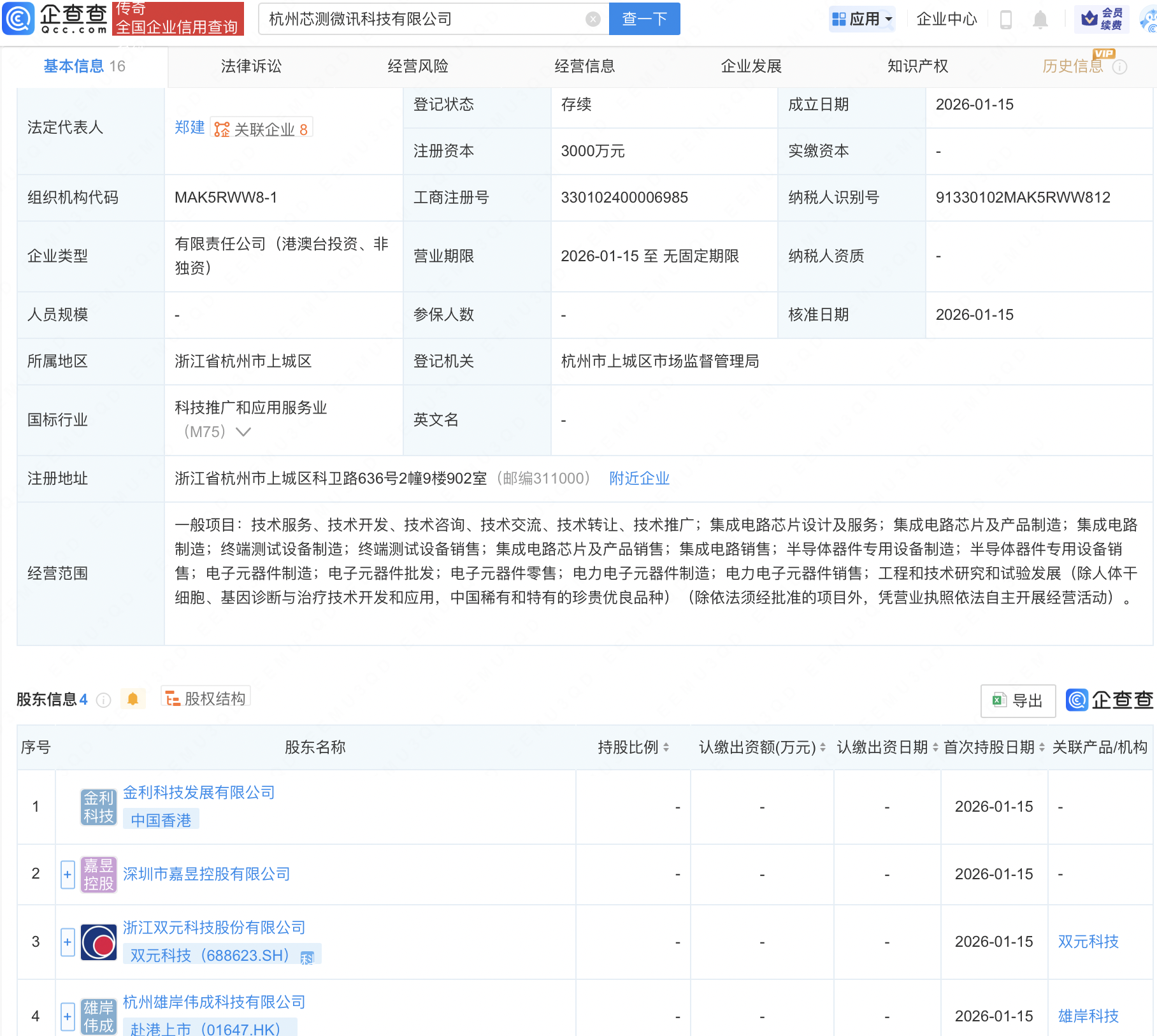 企查查APP显示,近日,杭州芯测微讯科技有限公司成立,注册资本3000万元,经营范围包含:集成电路芯片及产品销售;集成电路销售;半导体器件专用设备制造;半导体器件专用设备销售等。企查查股权穿透显示,该公司由双元科技(688623)等共同持股。