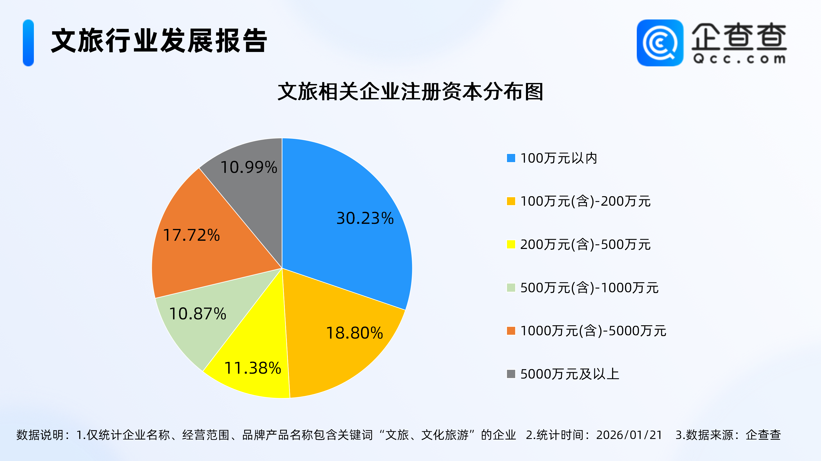 企查查数据显示,从注册资本分布来看,文旅相关企业多为轻量级企业,注册资本在200万元以内的相关企业占比近半数,其中注册资本在100万元以内的企业最多,占比30.23%,在100万元(含)-200万元的相关企业占比18.80%。此外,千万级相关企业合计占比28.72%。