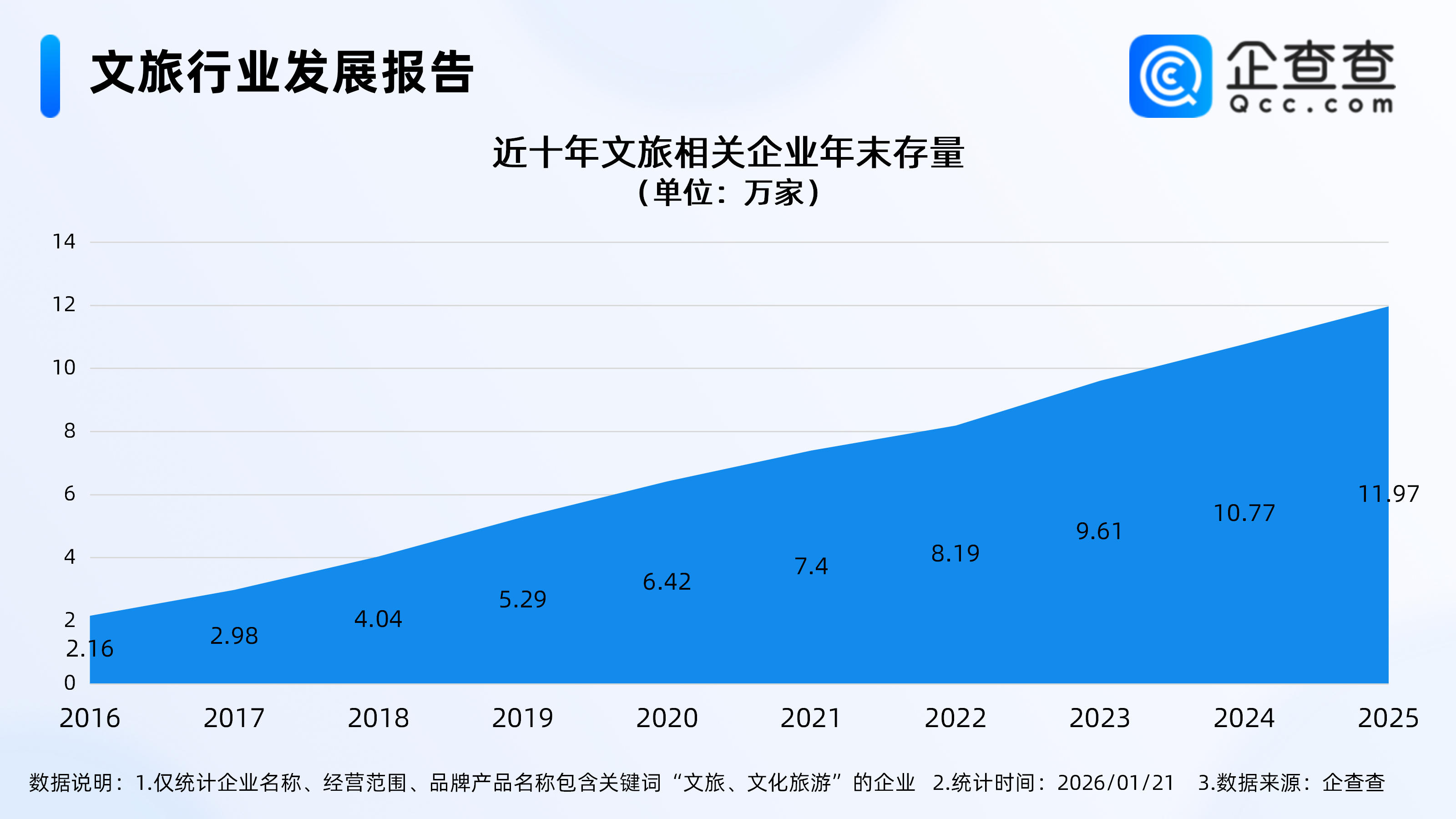 企查查数据显示,截至1月21日,国内现存文旅相关企业12.51万家。近十年文旅相关企业存量规模持续增长,2024年相关企业存量规模首次突破10万家,达10.77万家。2025年末存量达11.97万家,较十年前(2016年)增长了近5倍。