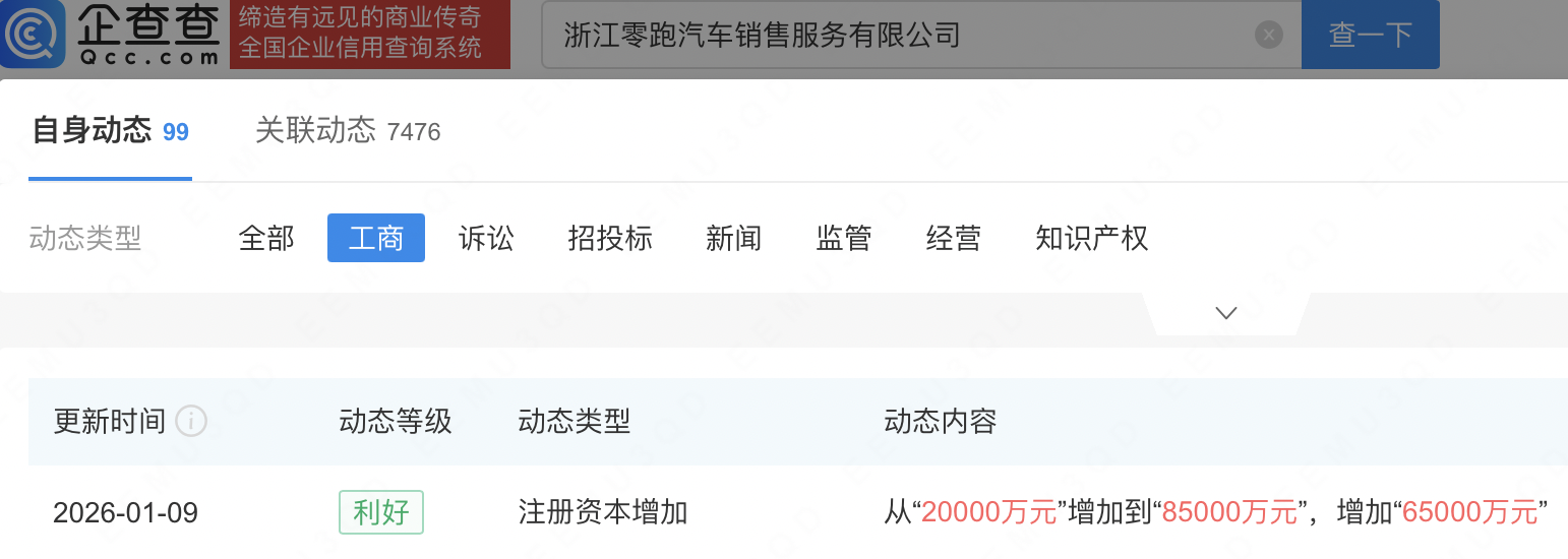 企查查APP显示,近日,浙江零跑汽车销售服务有限公司发生工商变更,注册资本由2亿元增至8.5亿元,增幅325%。企查查信息显示,该公司成立于2018年,由零跑汽车(09863.HK)全资持股。