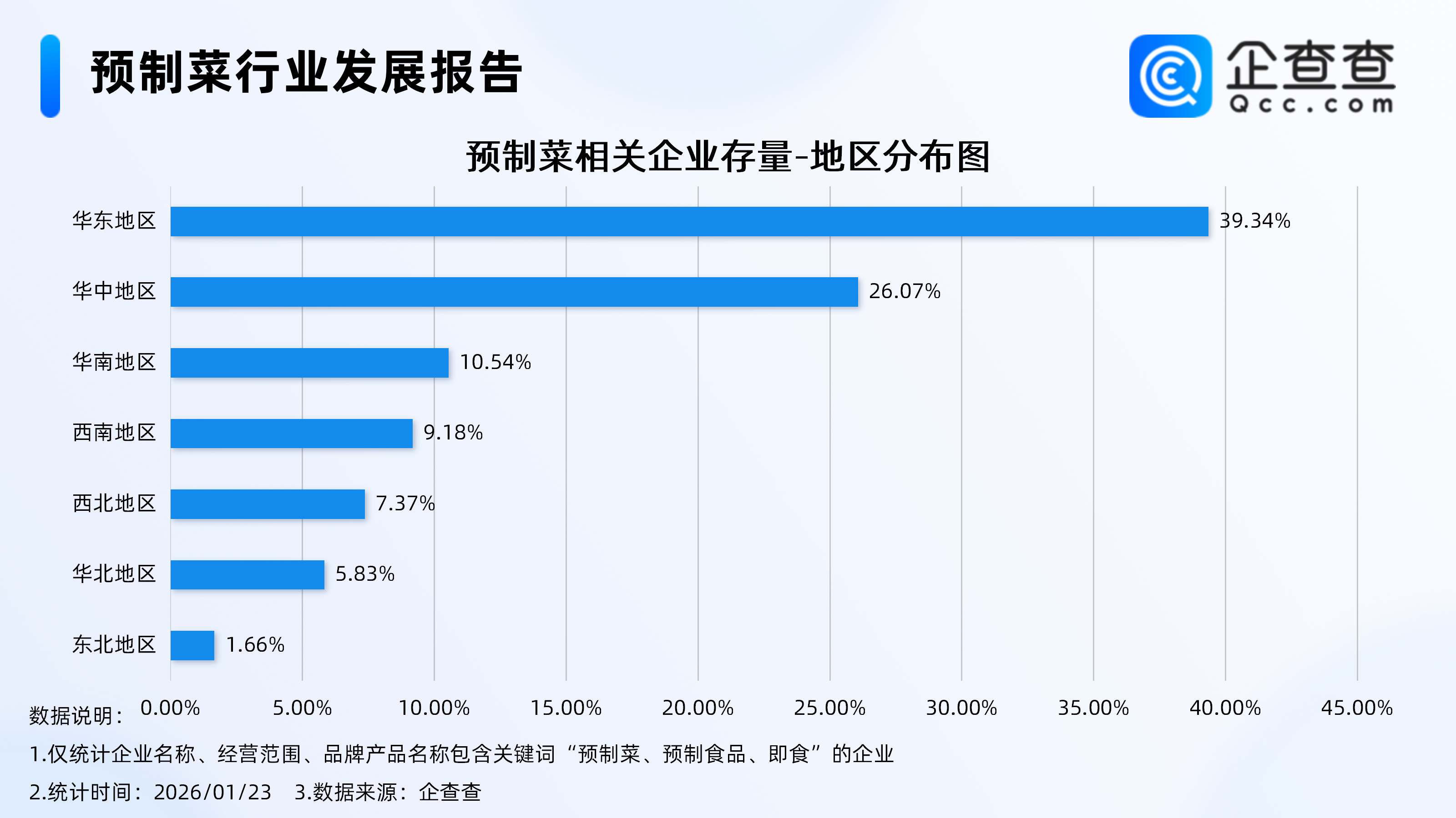 企查查数据显示,截至1月23日,国内现存预制菜相关企业3.23万家。近十年相关企业注册量呈持续增长态势,2025年全年注册1.4万家,同比增长18.58%,增速趋稳。截至目前,今年已注册712家相关企业。存量方面,从注册资本来看,预制菜相关企业多为轻量级企业,注册资本在200万元以下的相关企业占比超七成。从地区分布来看,预制菜相关企业主要分布在华东地区、华中地区,分别占比39.34%、26.07%。