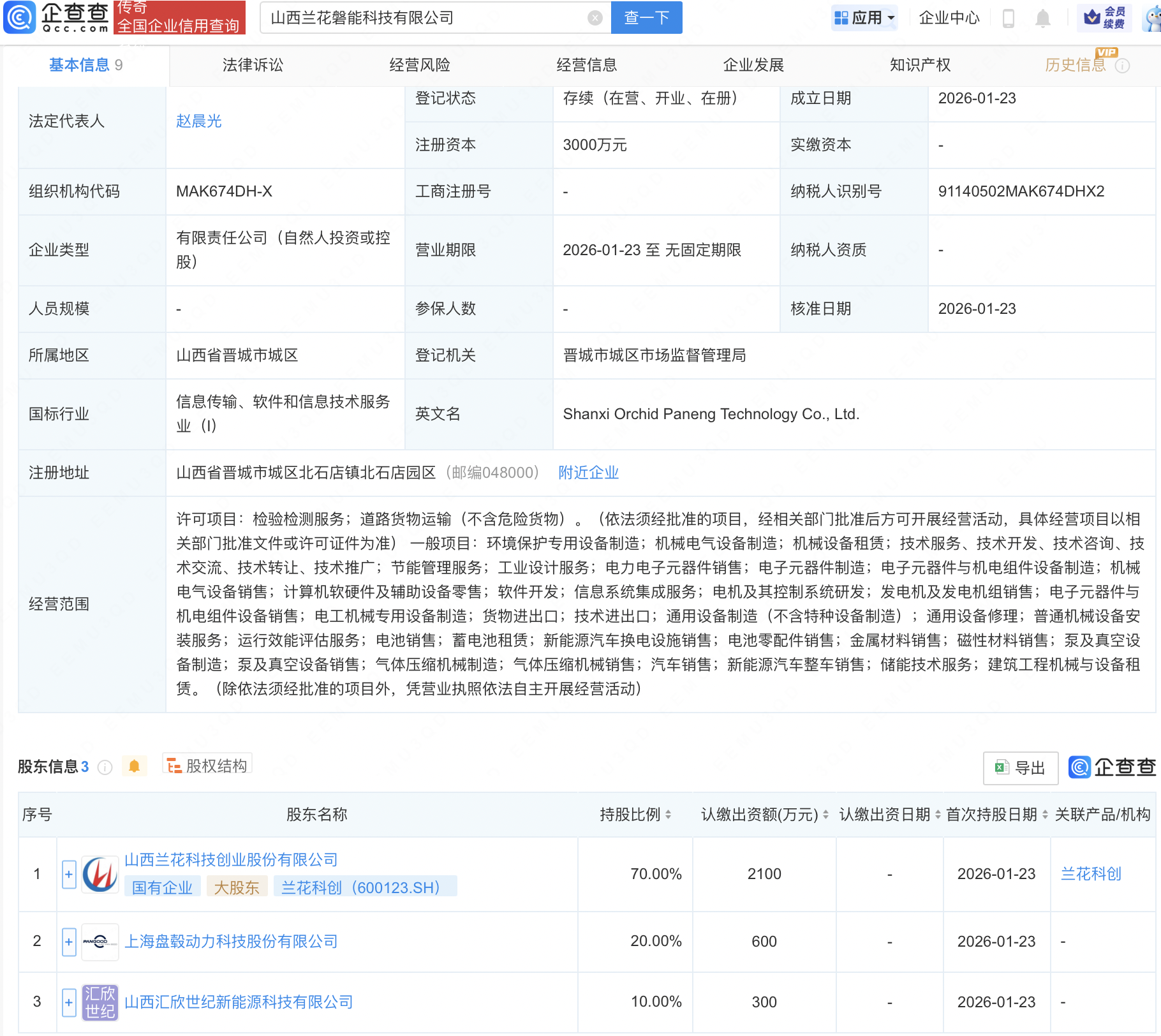 企查查APP显示,近日,山西兰花磐能科技有限公司成立,注册资本3000万元,经营范围包含:电池销售;蓄电池租赁;新能源汽车换电设施销售;电池零配件销售;金属材料销售等。企查查股权穿透显示,该公司由兰花科创(600123)等共同持股。