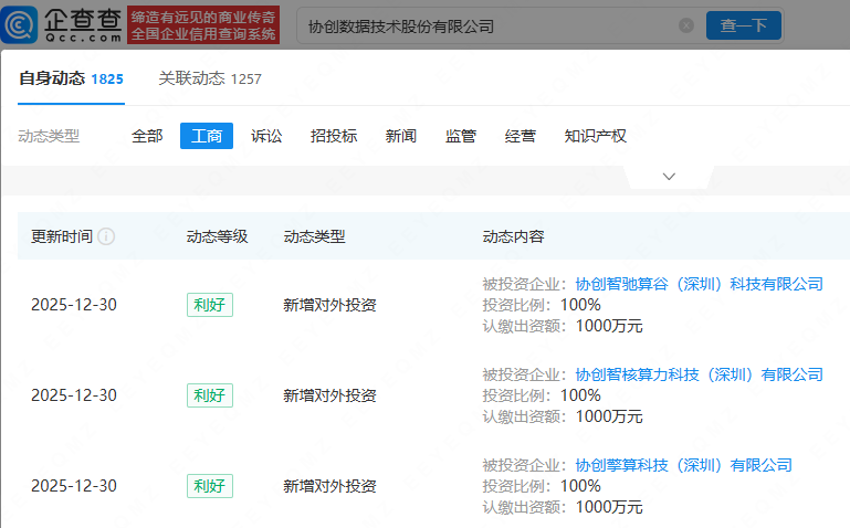 企查查APP显示,近日,协创智驰算谷(深圳)科技有限公司、协创智核算力科技(深圳)有限公司、协创擎算科技(深圳)有限公司成立,注册资本均为1000万元,均由协创数据(300857)全资持股。