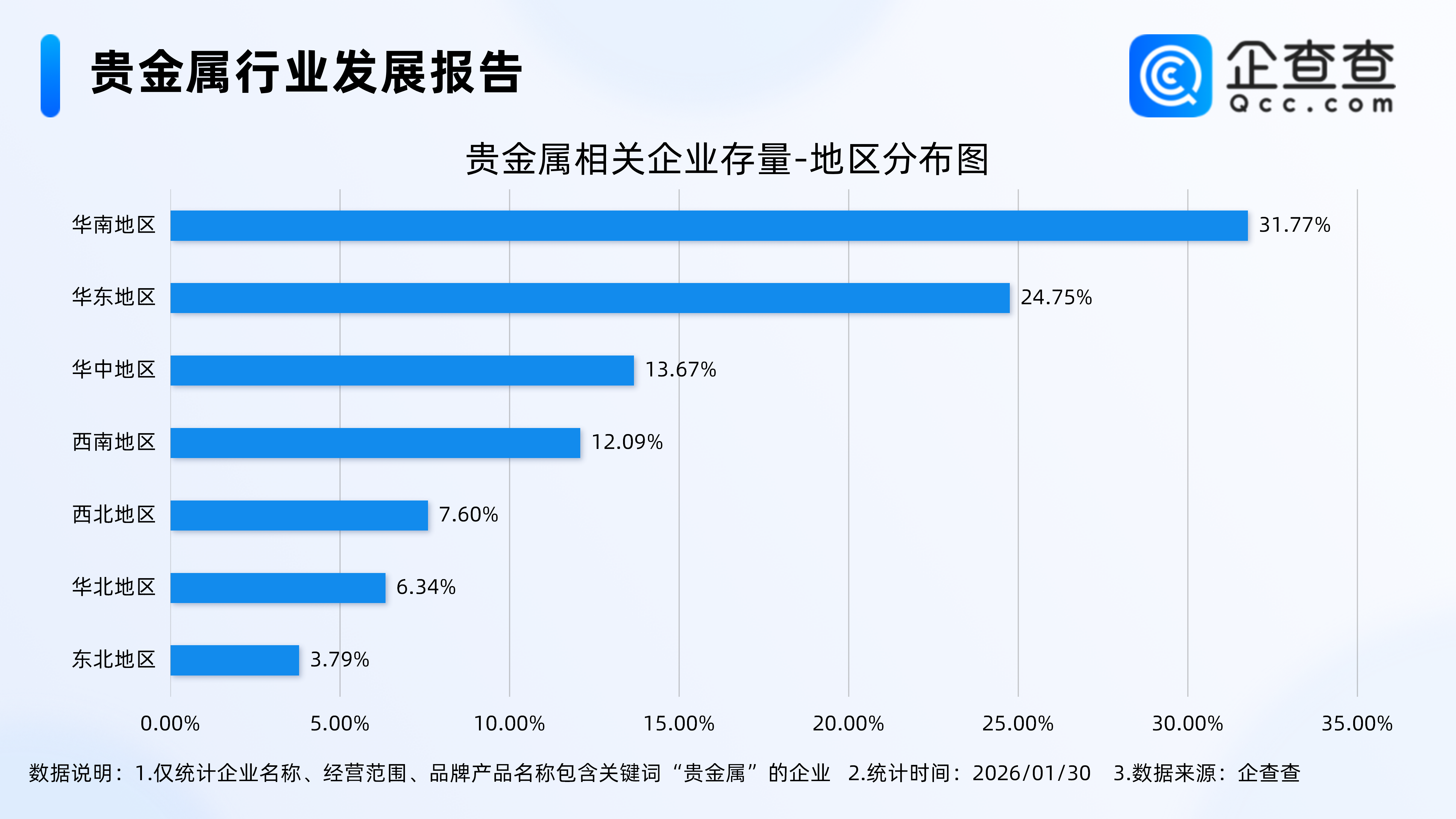 企查查数据显示,从地区分布来看,分布在华南地区的贵金属相关企业最多,占比31.77%。其次,分布在华东地区、华中地区的贵金属相关企业分别占比24.75%、13.67%。