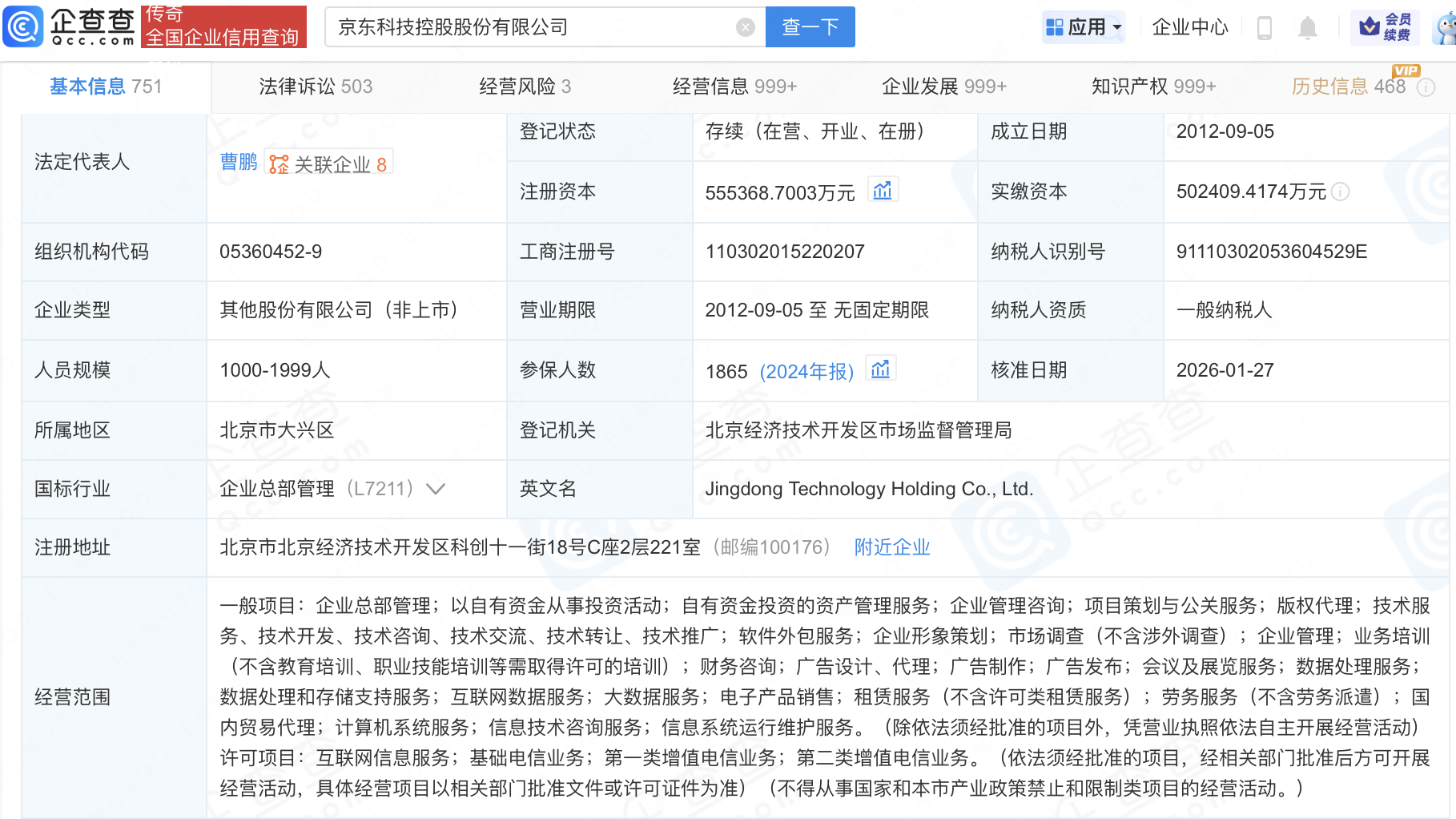 企查查APP显示,近日,京东科技控股股份有限公司发生工商变更,注册资本由53.86亿元增至55.54亿元。企查查信息显示,该公司成立于2012年,经营范围包含:互联网信息服务;基础电信业务;第一类增值电信业务;第二类增值电信业务等。