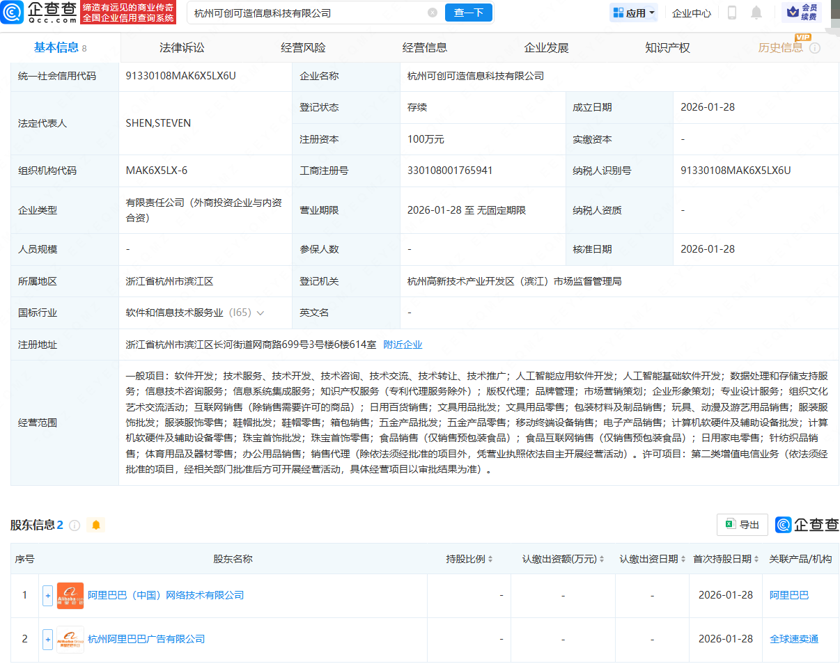 企查查APP显示,近日,杭州可创可造信息科技有限公司成立,法定代表人为SHEN,STEVEN,经营范围包含:软件开发;人工智能应用软件开发;人工智能基础软件开发;数据处理和存储支持服务等。企查查股权穿透显示,该公司由阿里巴巴(中国)网络技术有限公司、杭州阿里巴巴广告有限公司共同持股。