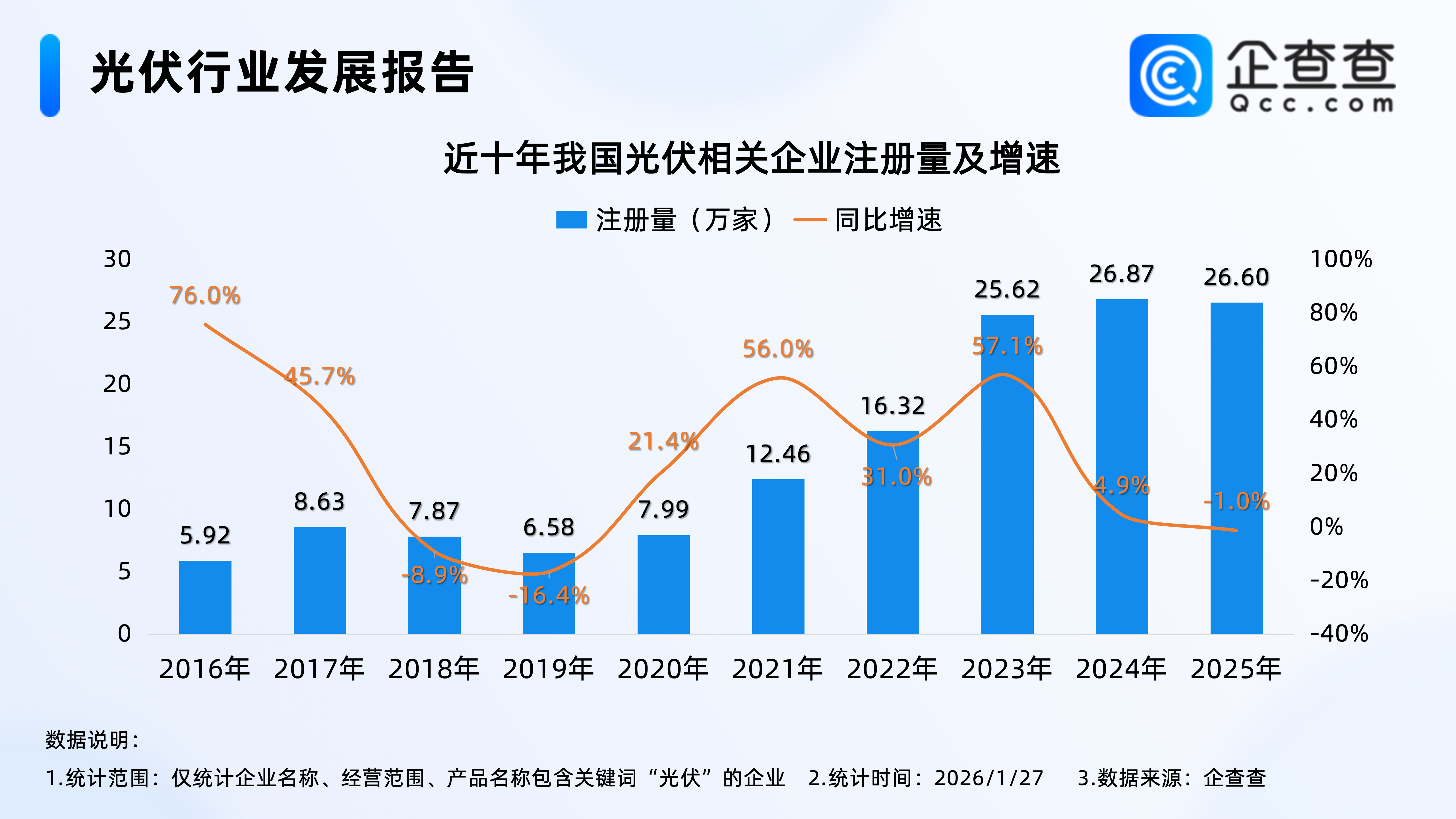 企查查数据显示,2016年至2022年期间,我国光伏相关企业注册量基本逐年增加,2023年注册量同比大幅增加57.1%至25.62万家,此后两年,我国光伏相关企业注册量均在26万家以上,2025年全年,我国累计注册26.60万家光伏相关企业;截至1月27日,2026年我国已注册1.55万家光伏相关企业。