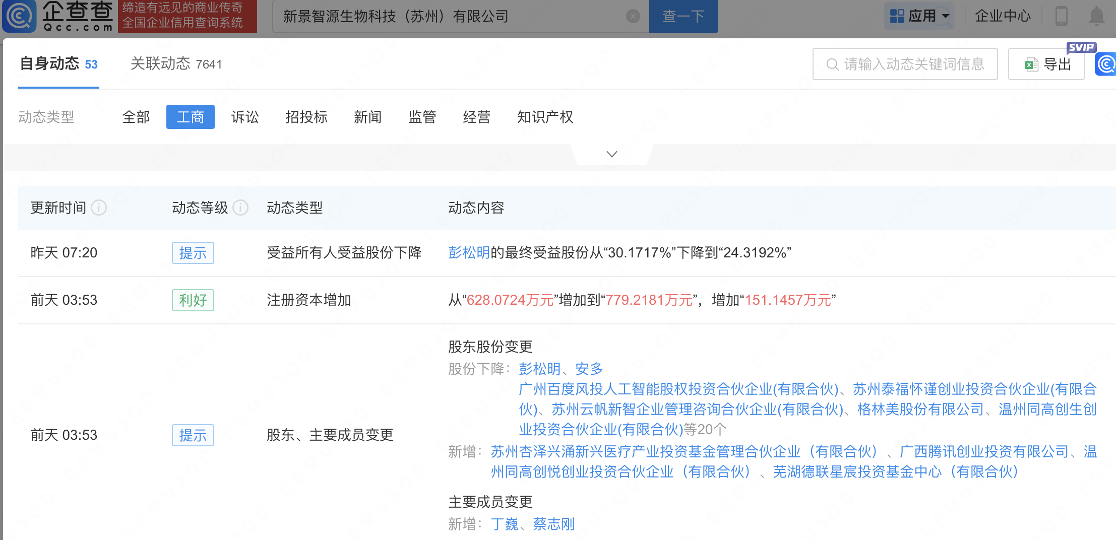 企查查APP显示,近日,新景智源生物科技(苏州)有限公司发生工商变更,新增广西腾讯创业投资有限公司等为股东,同时注册资本增至779.22万元。企查查信息显示,该公司成立于2020年,经营范围包含:药品生产;技术服务、技术开发、技术咨询、技术交流、技术转让、技术推广;医学研究和试验发展。据其官网,该公司是一家专注于开发实体瘤TCR-T免疫细胞治疗药物、研发临床技术和转化的创新型公司。