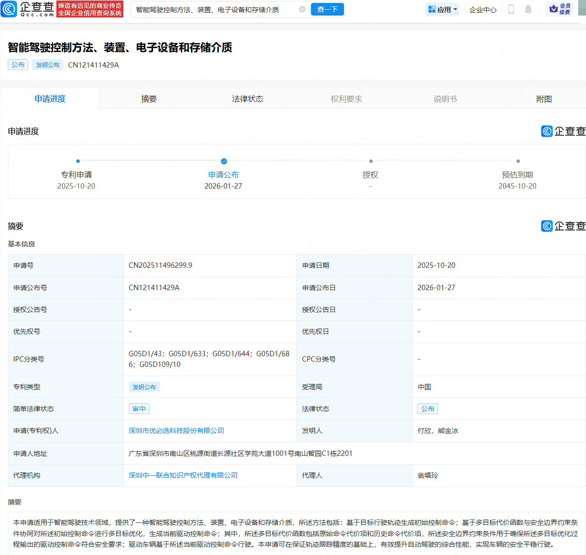 企查查APP显示,近日,优必选(09880.HK)申请公布“智能驾驶控制方法、装置、电子设备和存储介质”专利。