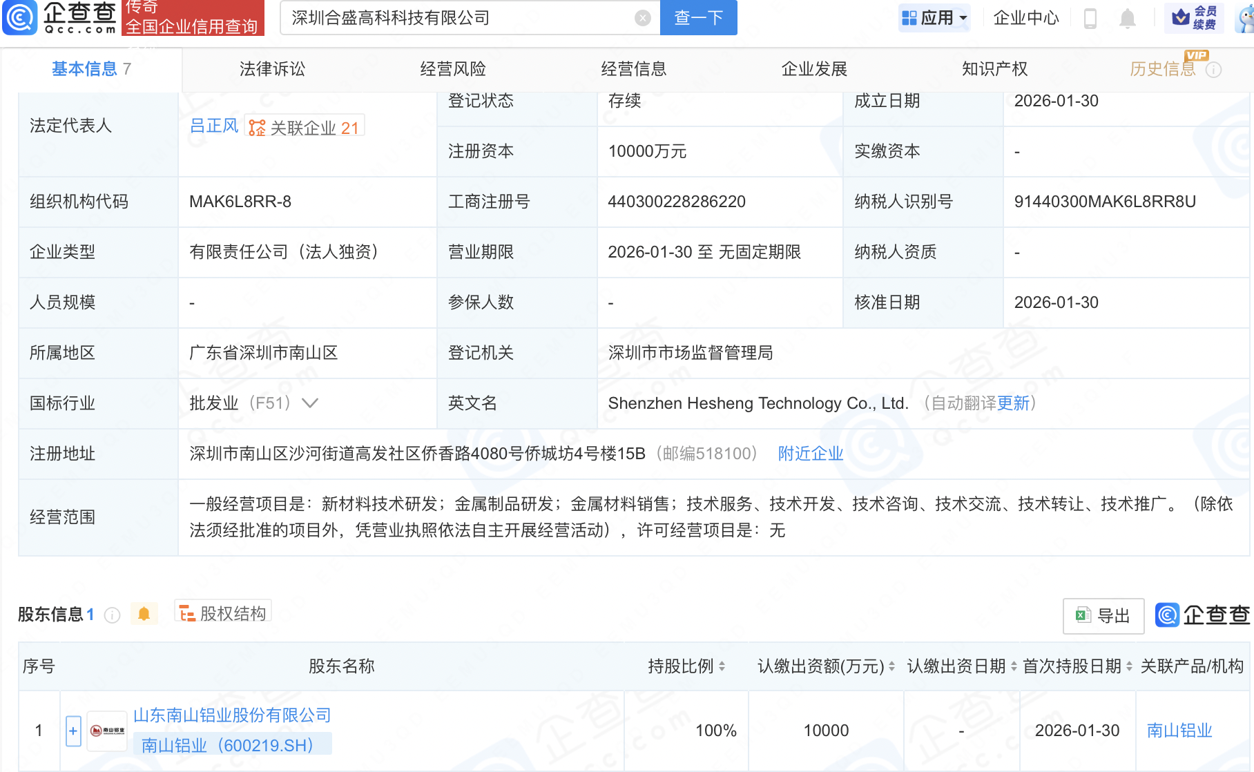 企查查APP显示,近日,深圳合盛高科科技有限公司成立,注册资本1亿元,经营范围包含:新材料技术研发;金属制品研发;金属材料销售等。企查查股权穿透显示,该公司由南山铝业(600219)全资持股。
