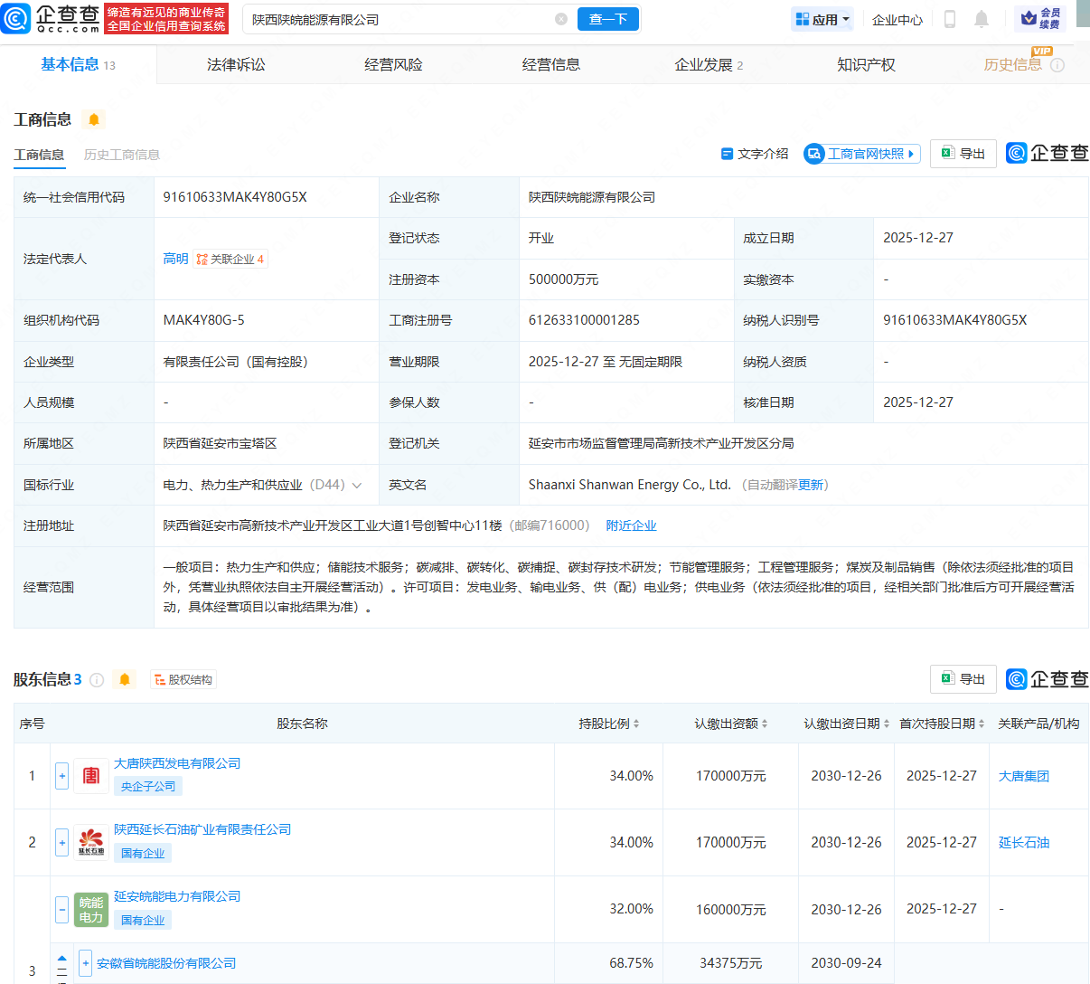 企查查APP显示,近日,陕西陕皖能源有限公司成立,法定代表人为高明,注册资本为50亿元,经营范围包含:热力生产和供应;储能技术服务;碳减排、碳转化、碳捕捉、碳封存技术研发;节能管理服务等。企查查股权穿透显示,该公司由大唐陕西发电有限公司、陕西延长石油矿业有限责任公司、皖能电力(000543)旗下延安皖能电力有限公司共同持股。