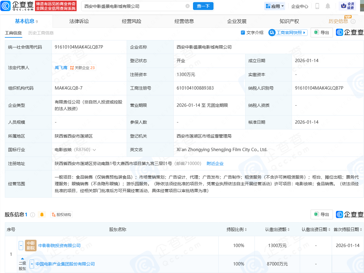 企查查APP显示,近日,西安中影盛景电影城有限公司成立,法定代表人为禹飞鹰,注册资本为1300万元,经营范围包含:市场营销策划;广告设计、代理;广告发布;广告制作;游乐园服务;电影放映等。企查查股权穿透显示,该公司由中国电影(600977)间接全资持股。