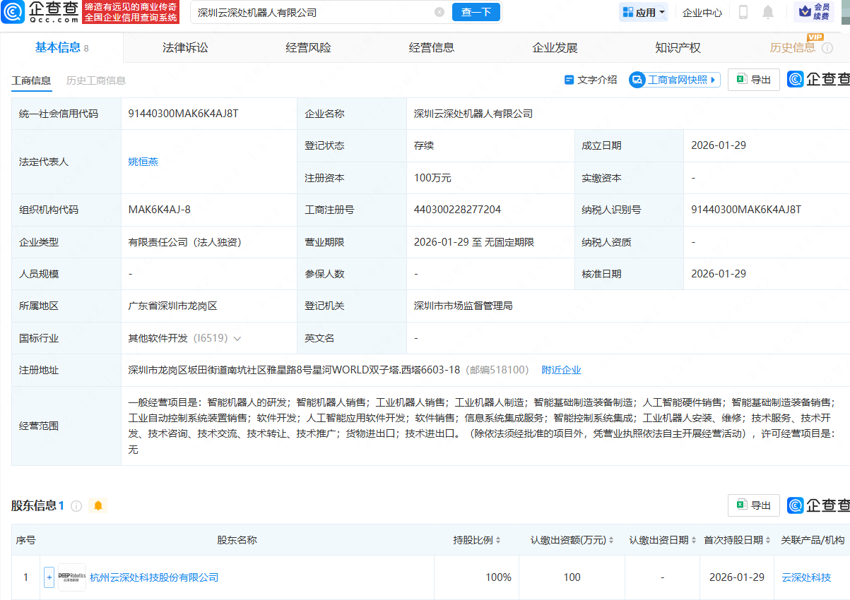 企查查APP显示,近日,深圳云深处机器人有限公司成立,法定代表人为姚恒燕,经营范围包含:智能机器人的研发;智能机器人销售;工业机器人销售;工业机器人制造;智能基础制造装备制造等。企查查股权穿透显示,该公司由杭州云深处科技股份有限公司全资持股。