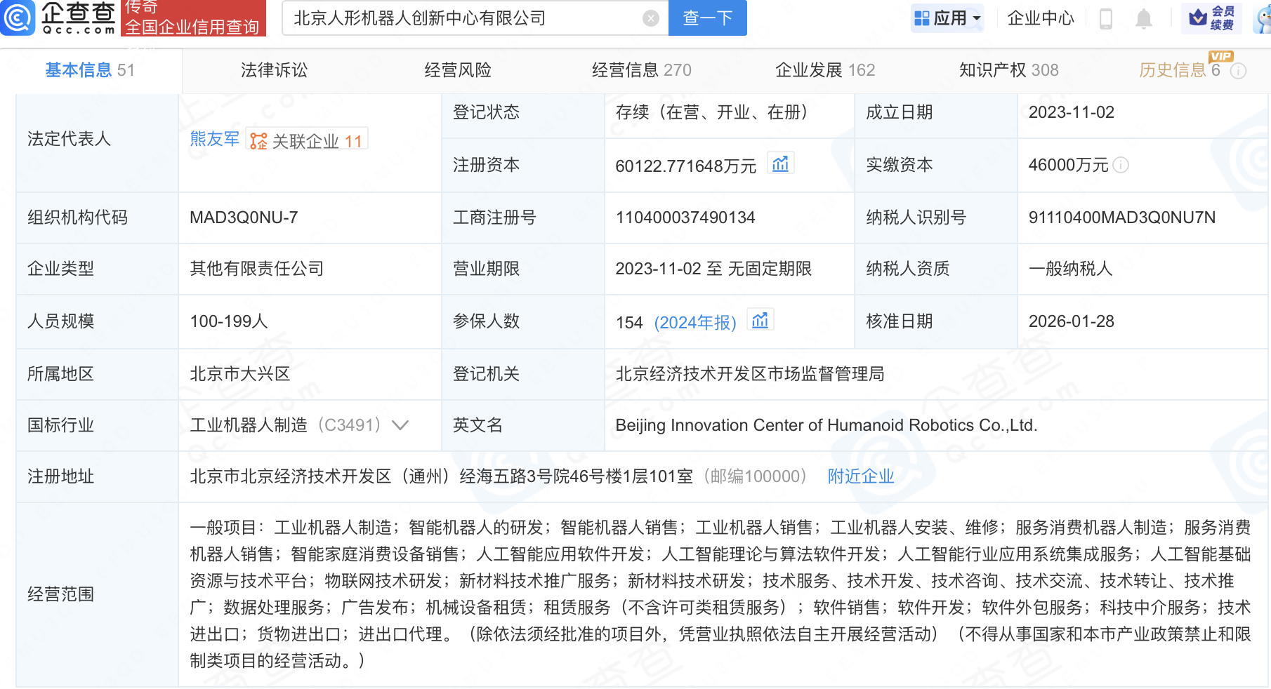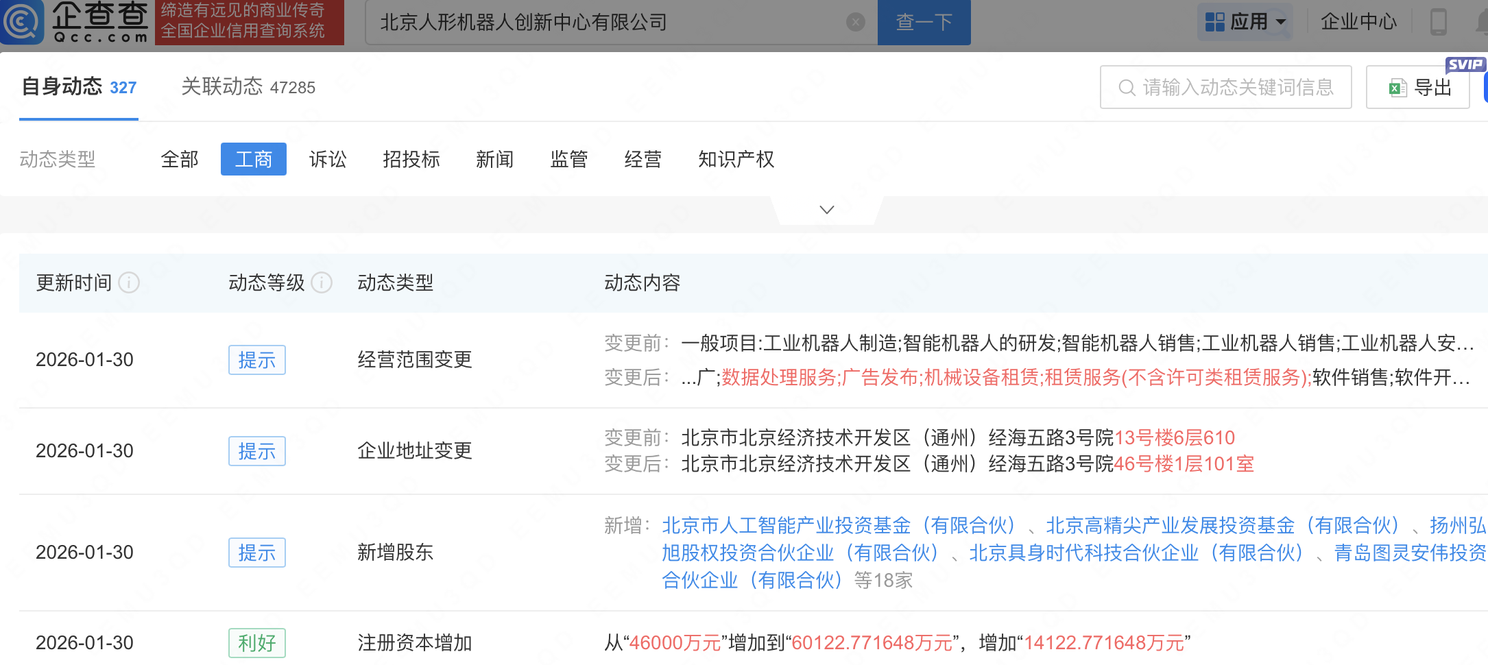 企查查APP显示,近日,北京人形机器人创新中心有限公司发生工商变更,新增北京市人工智能产业投资基金(有限合伙)等为股东,同时注册资本增至6.01亿元。企查查信息显示,该公司成立于2023年,经营范围包含:工业机器人制造;智能机器人的研发;智能机器人销售;工业机器人销售等。