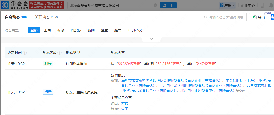 企查查APP显示,近日,北京面壁智能科技有限责任公司发生工商变更,注册资本增加至约68.84万元,新增深圳市宝实新桥国科瑞华私募股权投资基金合伙企业(有限合伙)、中金保时捷(上海)创业投资合伙企业(有限合伙)等为股东,同时,部分主要人员也发生变更。