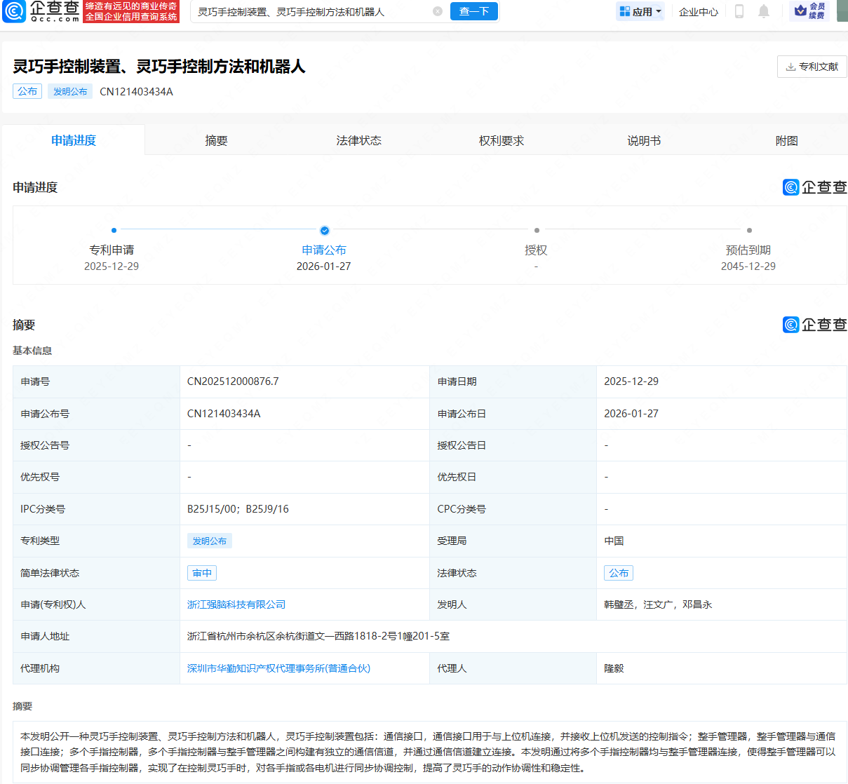 企查查APP显示,近日,浙江强脑科技有限公司申请公布“灵巧手控制装置、灵巧手控制方法和机器人”专利。