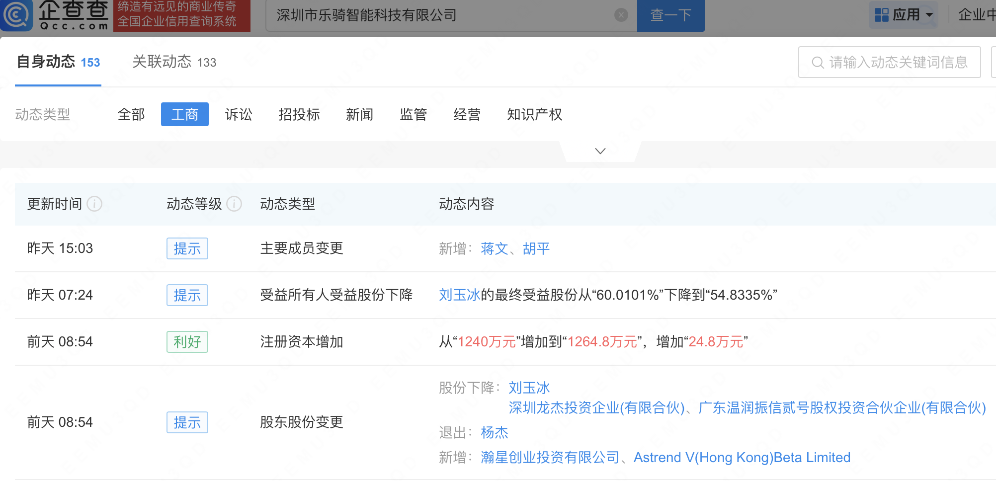 企查查APP显示,近日,深圳市乐骑智能科技有限公司发生工商变更,新增小米关联公司瀚星创业投资有限公司等为股东,同时注册资本增至1264.8万元。企查查信息显示,该公司成立于2016年,经营范围包含:智能出行设备的研发、设计、生产、销售等。公开信息显示,乐骑智能是一家致力于以IOT智能互联、智能体感交互和智能机器人技术,深耕智能出行短交通领域的企业。