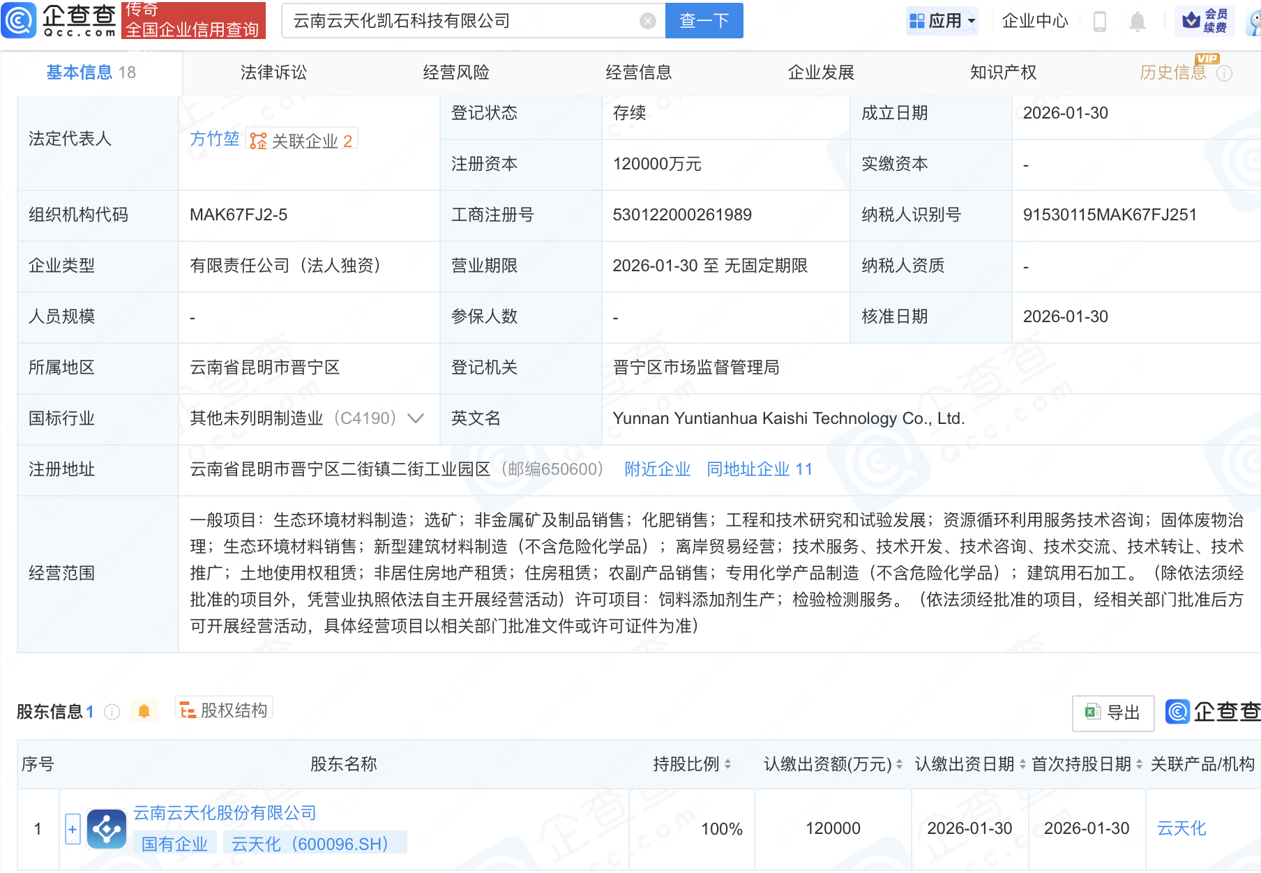 企查查APP显示,近日,云南云天化凯石科技有限公司成立,注册资本12亿元,经营范围包含:生态环境材料制造;选矿;非金属矿及制品销售;化肥销售;工程和技术研究和试验发展等。企查查股权穿透显示,该公司由云天化(600096)全资持股。