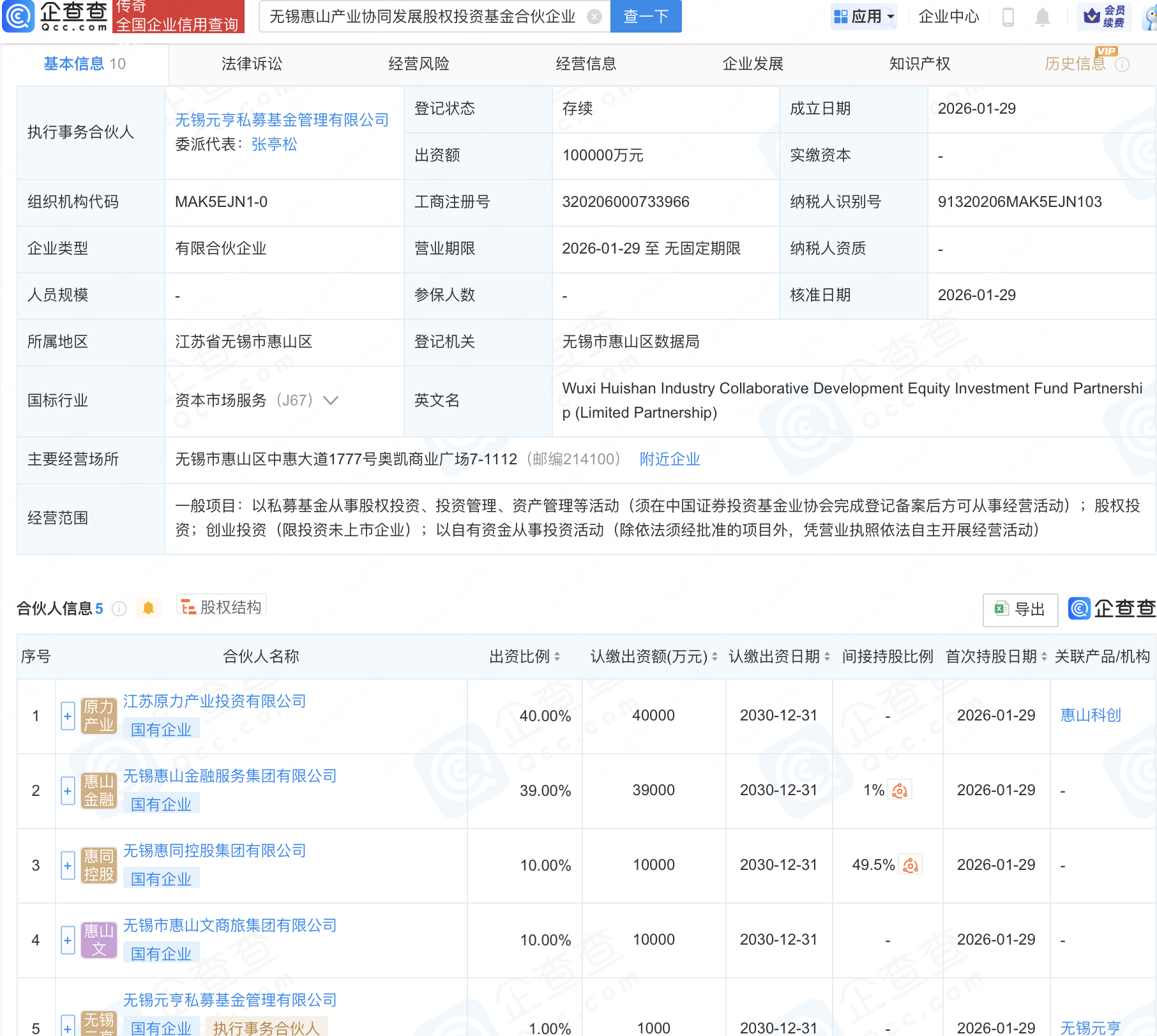 企查查APP显示,近日,无锡惠山产业协同发展股权投资基金合伙企业(有限合伙)成立,出资额10亿元,经营范围包含:以私募基金从事股权投资、投资管理、资产管理等活动。企查查股权穿透显示,该企业由江苏原力产业投资有限公司等共同出资。