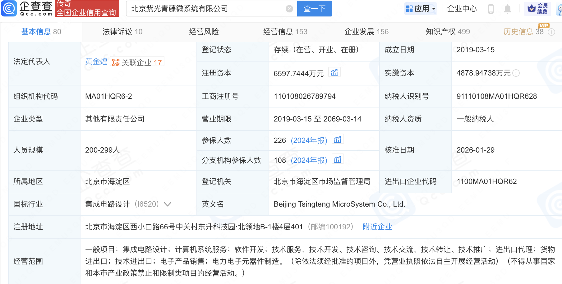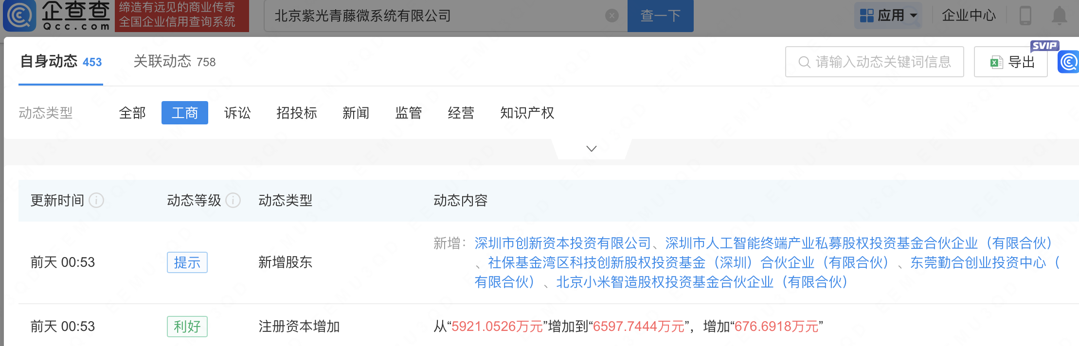 企查查APP显示,近日,北京紫光青藤微系统有限公司发生工商变更,新增北京小米智造股权投资基金合伙企业(有限合伙)等为股东,同时注册资本增至6597.74万元。企查查信息显示,该公司成立于2019年,经营范围包含:集成电路设计;计算机系统服务;软件开发等。据其官网,紫光青藤是一家智能物联芯片及解决方案提供商,提供安全存储芯片、近场通信 NFC芯片等系列产品,主要面向智能设备、物联网等领域提供完善的解决方案。