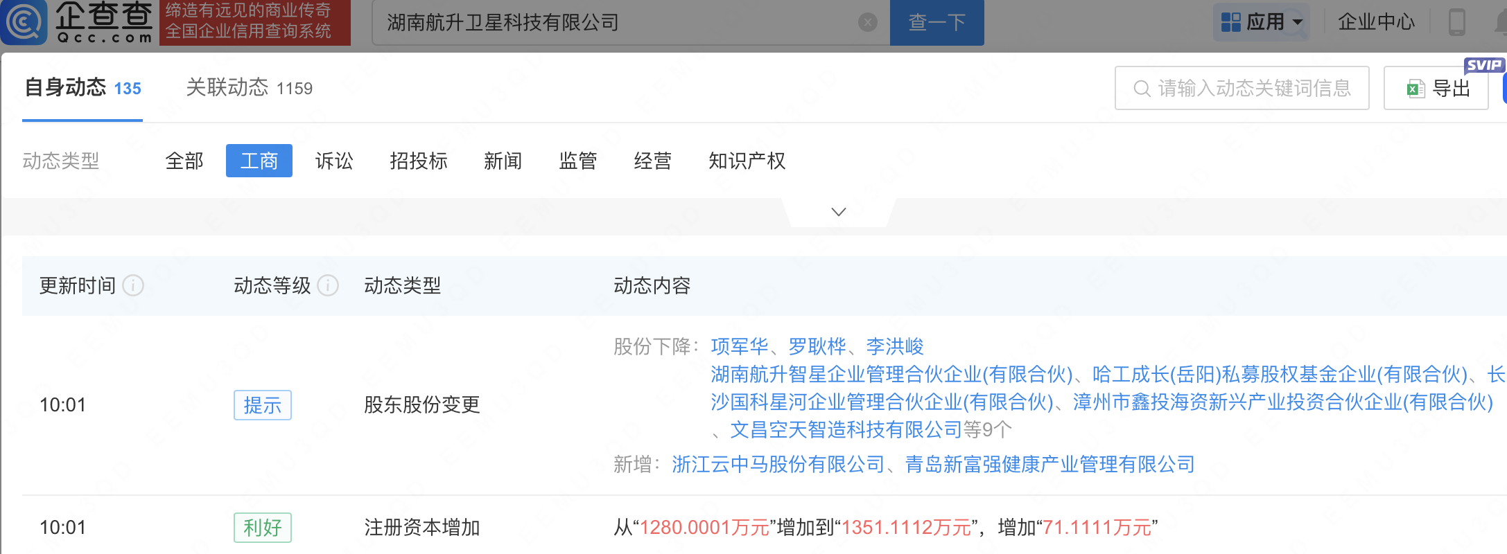 企查查APP显示,近日,湖南航升卫星科技有限公司发生工商变更,新增云中马(603130)等为股东,同时注册资本增至1351.11万元。企查查信息显示,该公司成立于2015年,经营范围包含:航空航天配套零部件、航空航天地面装备、航空航天非标设备设计;航空航天配套零部件、航空航天地面装备、航空航天非标设备、电子产品的生产等。据其官网,航升卫星是一家商业微小卫星研发商,其具备独立的卫星总体设计与工程研制能力。
