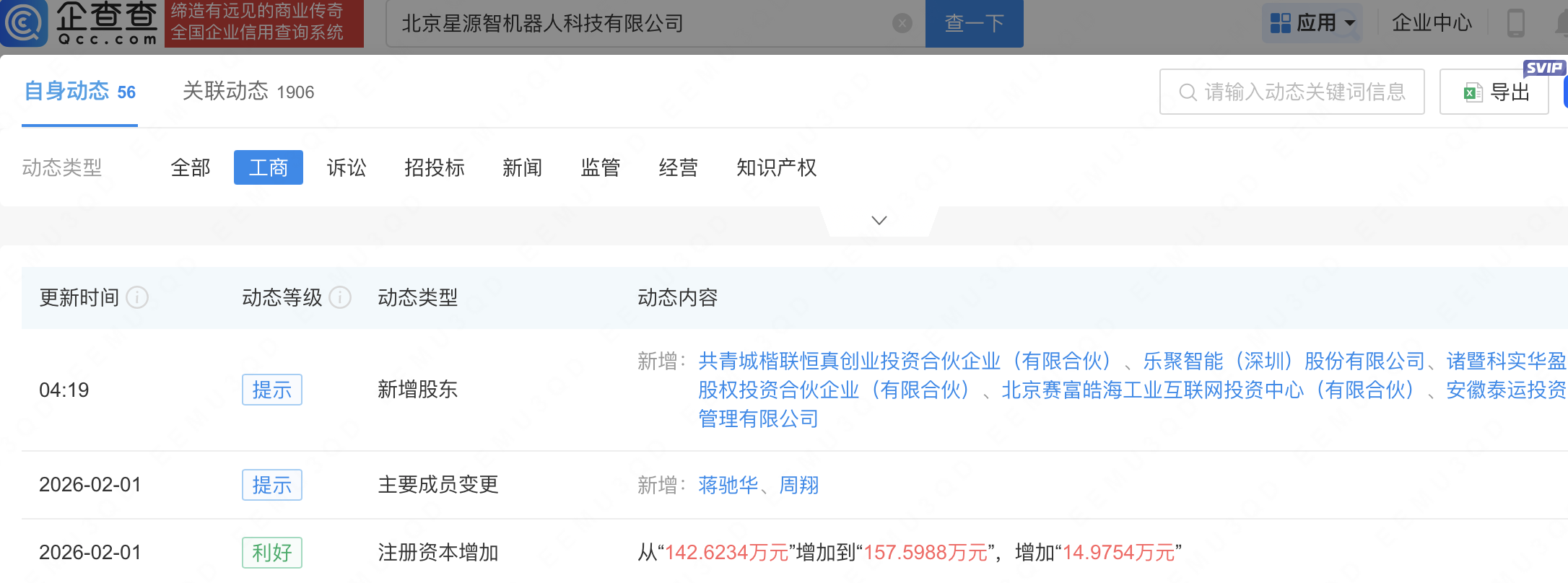 企查查APP显示,近日,北京星源智机器人科技有限公司发生工商变更,新增乐聚机器人关联公司乐聚智能(深圳)股份有限公司等为股东,同时注册资本增至157.6万元。企查查信息显示,该公司成立于2025年8月,经营范围包含:服务消费机器人制造;服务消费机器人销售;智能机器人的研发;智能机器人销售等。公开信息显示,星源智系北京智源人工智能研究院孵化的具身智能公司,星源智致力于实现多模态空间智能,构建物理世界的通用具身大脑。